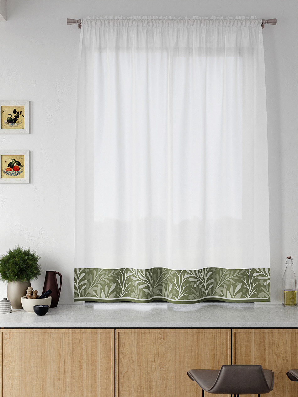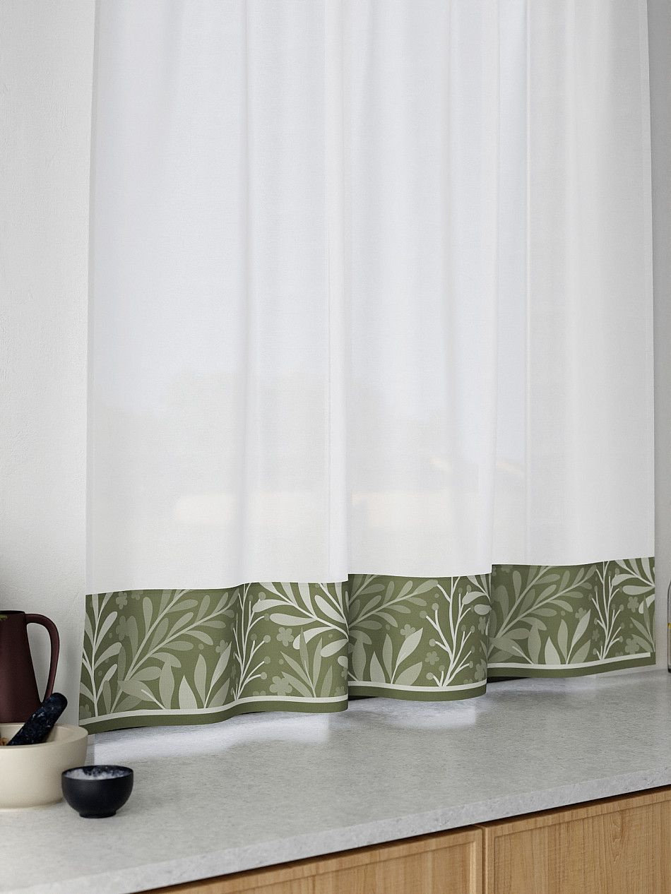 Легкая основа (вуаль) дополнена по нижнему краю портьерной тканью (габардин) с печатным рисунком. Вуаль с матовой полупрозрачной текстурой. Отличается особым шиком, идеально подходит для создания воздушных штор. Придает ощущение свежести, хорошо пропускает воздух. Ткань неприхотлива в уходе, хорошо стирается без разрушения волокон с течением времени за счет высокого кручения нитей.