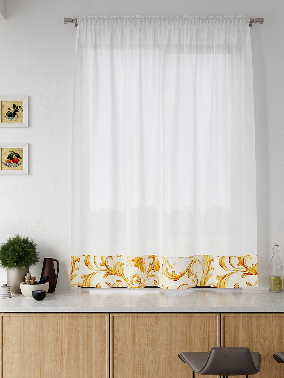 Легкая основа (вуаль) дополнена по нижнему краю портьерной тканью (габардин) с печатным рисунком. Вуаль с матовой полупрозрачной текстурой. Отличается особым шиком, идеально подходит для создания воздушных штор. Придает ощущение свежести, хорошо пропускает воздух. Ткань неприхотлива в уходе, хорошо стирается без разрушения волокон с течением времени за счет высокого кручения нитей.