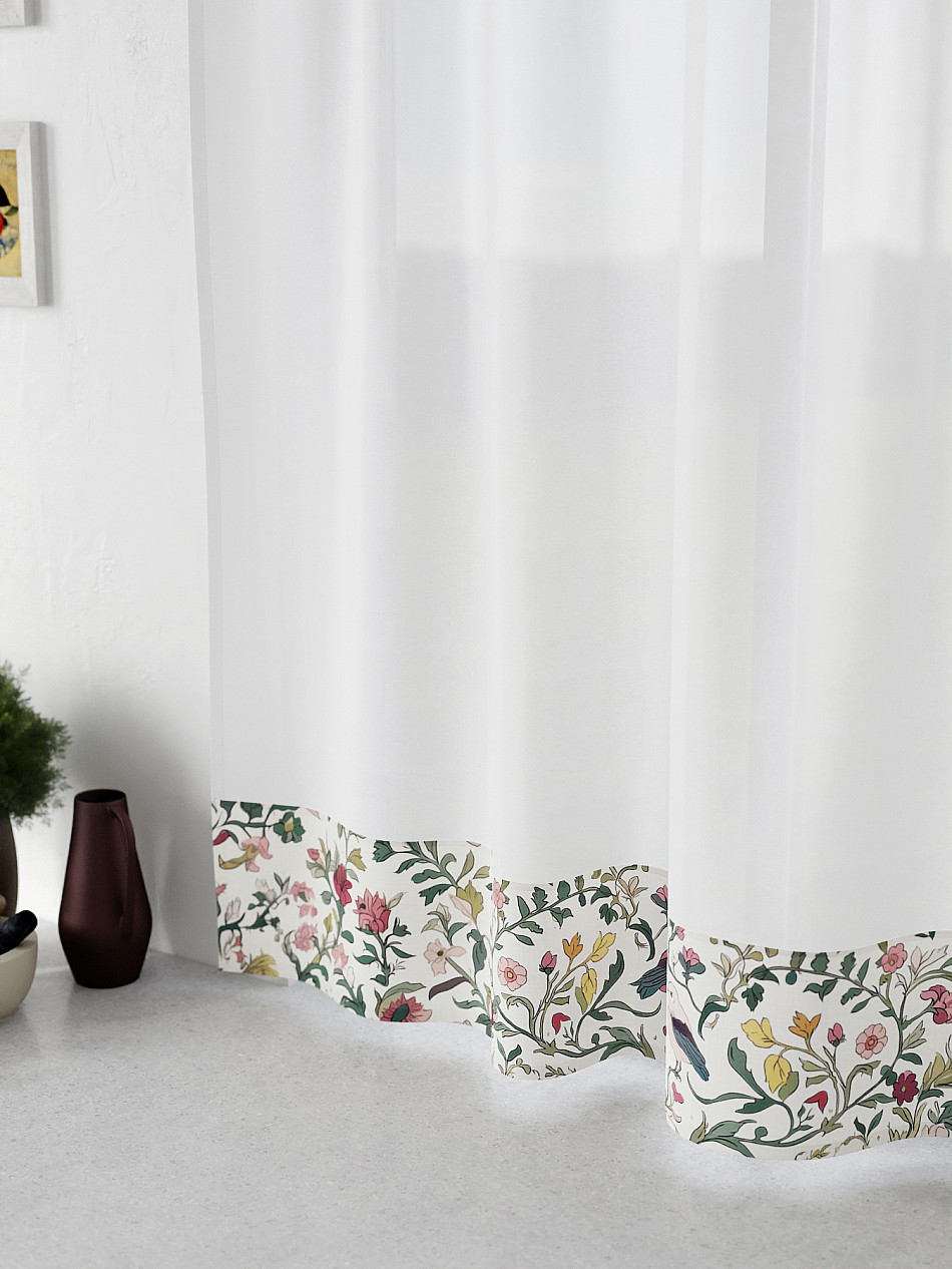 Легкая основа (вуаль) дополнена по нижнему краю портьерной тканью (габардин) с печатным рисунком. Вуаль с матовой полупрозрачной текстурой. Отличается особым шиком, идеально подходит для создания воздушных штор. Придает ощущение свежести, хорошо пропускает воздух. Ткань неприхотлива в уходе, хорошо стирается без разрушения волокон с течением времени за счет высокого кручения нитей.
