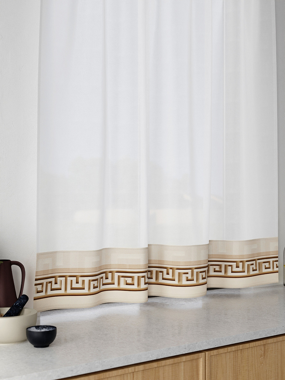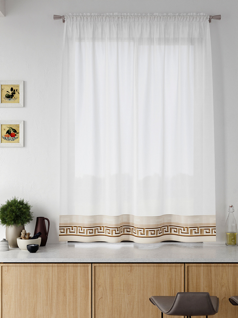 Легкая основа (вуаль) дополнена по нижнему краю портьерной тканью (габардин) с печатным рисунком. Вуаль с матовой полупрозрачной текстурой. Отличается особым шиком, идеально подходит для создания воздушных штор. Придает ощущение свежести, хорошо пропускает воздух. Ткань неприхотлива в уходе, хорошо стирается без разрушения волокон с течением времени за счет высокого кручения нитей.