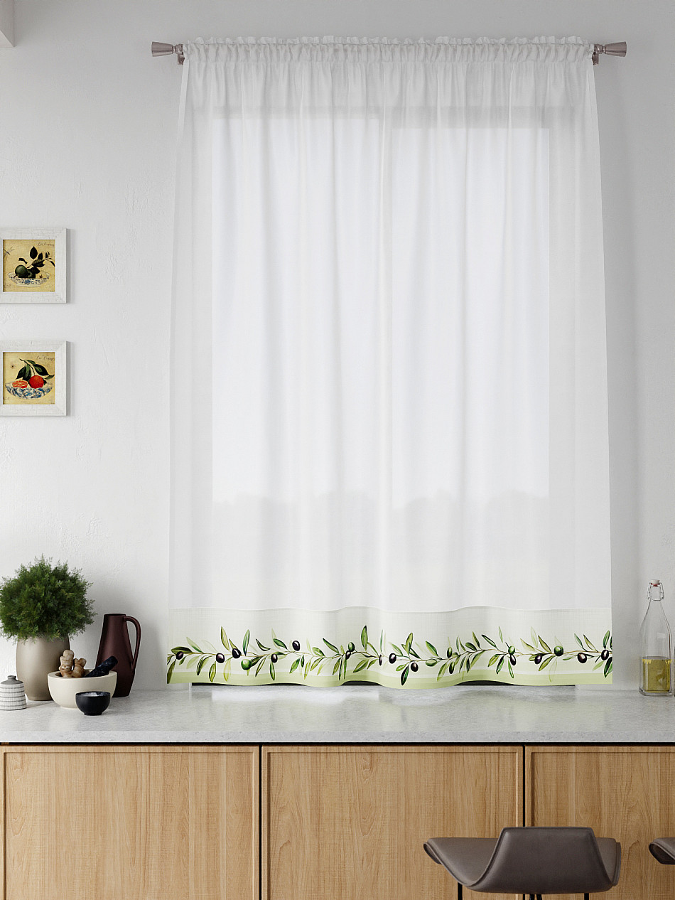 Легкая основа (вуаль) дополнена по нижнему краю портьерной тканью (габардин) с печатным рисунком. Вуаль с матовой полупрозрачной текстурой. Отличается особым шиком, идеально подходит для создания воздушных штор. Придает ощущение свежести, хорошо пропускает воздух. Ткань неприхотлива в уходе, хорошо стирается без разрушения волокон с течением времени за счет высокого кручения нитей.