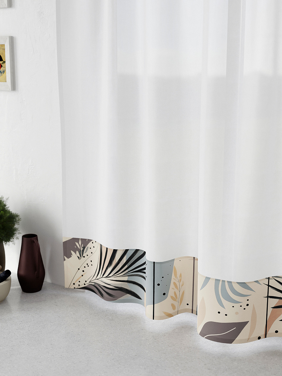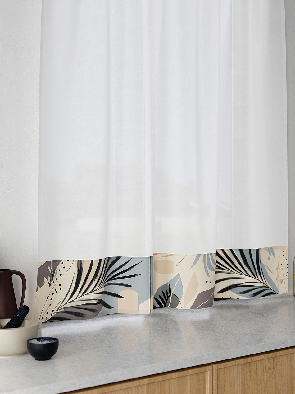 Легкая основа (вуаль) дополнена по нижнему краю портьерной тканью (габардин) с печатным рисунком. Вуаль с матовой полупрозрачной текстурой. Отличается особым шиком, идеально подходит для создания воздушных штор. Придает ощущение свежести, хорошо пропускает воздух. Ткань неприхотлива в уходе, хорошо стирается без разрушения волокон с течением времени за счет высокого кручения нитей.
