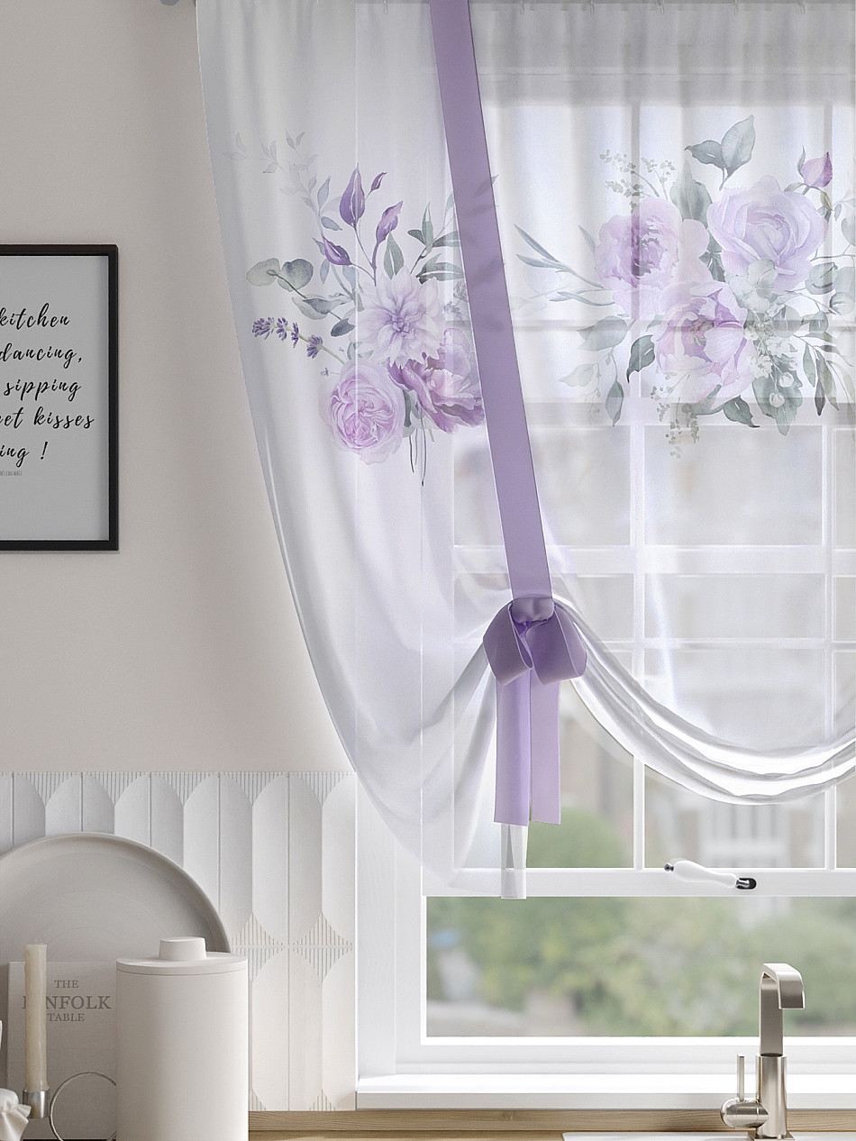 ВыбратьТюль 1 шт. Легкий, мягкий тюль из вуали оформлен фотопечатью, дополнен отделкой в виде декоративных завязок. Тюль имитирует римскую штору. Подъем и опускание осуществляется за счет декоративных лент. Вуаль с матовой полупрозрачной текстурой. Отличается особым шиком, идеально подходит для создания воздушных штор. Придает ощущение свежести, хорошо пропускает воздух. Ткань неприхотлива в уходе, хорошо стирается без разрушения волокон с течением времени за счет высокого кручения нитей.
