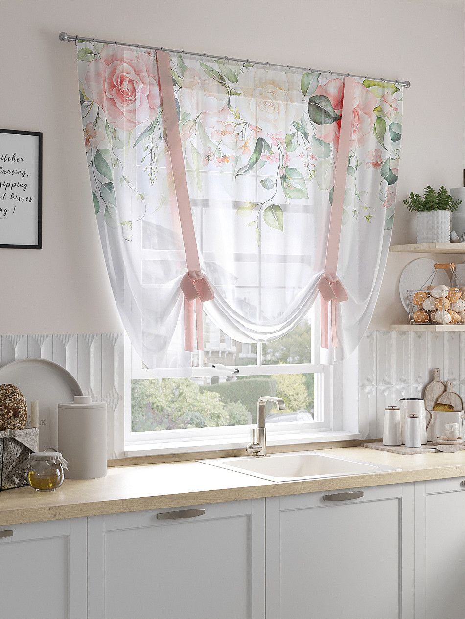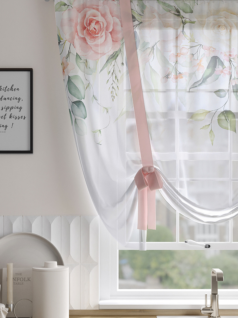 ВыбратьТюль 1 шт. Легкий, мягкий тюль из вуали оформлен фотопечатью, дополнен отделкой в виде декоративных завязок. Тюль имитирует римскую штору. Подъем и опускание осуществляется за счет декоративных лент. Вуаль с матовой полупрозрачной текстурой. Отличается особым шиком, идеально подходит для создания воздушных штор. Придает ощущение свежести, хорошо пропускает воздух. Ткань неприхотлива в уходе, хорошо стирается без разрушения волокон с течением времени за счет высокого кручения нитей.