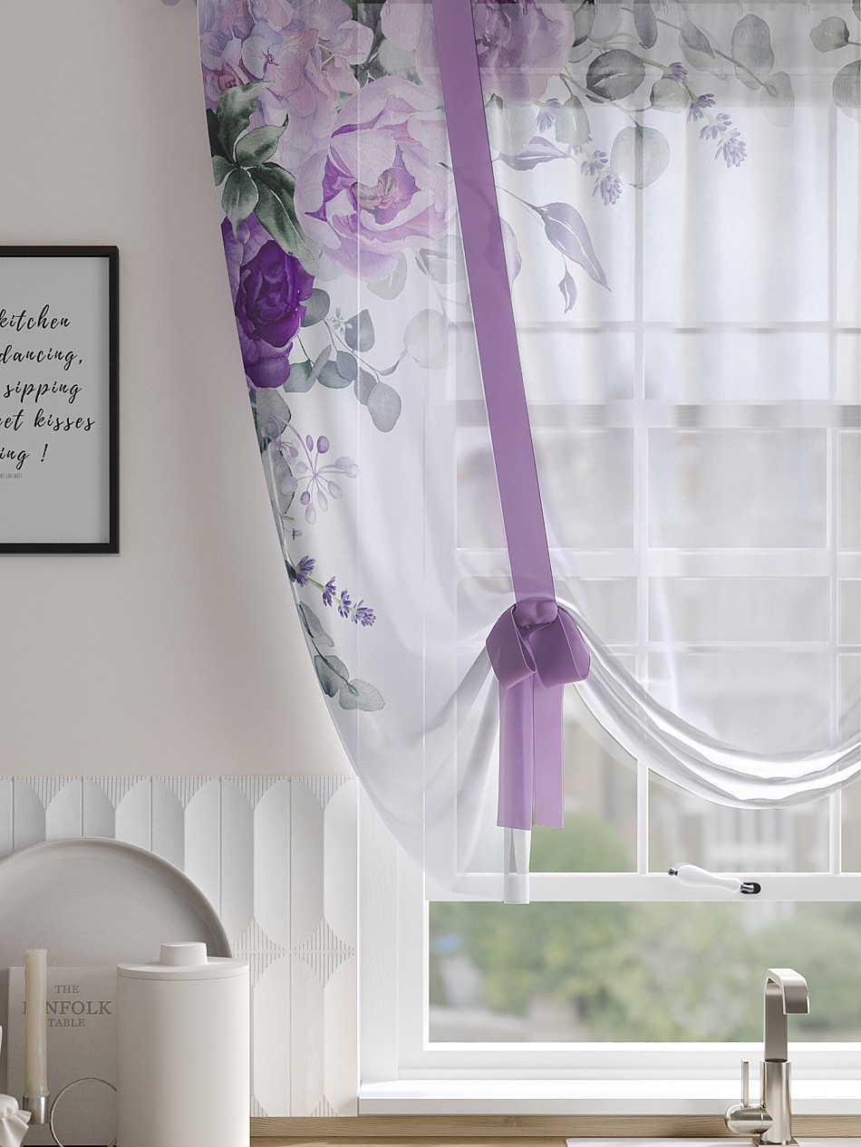 ВыбратьТюль 1 шт. Легкий, мягкий тюль из вуали оформлен фотопечатью, дополнен отделкой в виде декоративных завязок. Тюль имитирует римскую штору. Подъем и опускание осуществляется за счет декоративных лент. Вуаль с матовой полупрозрачной текстурой. Отличается особым шиком, идеально подходит для создания воздушных штор. Придает ощущение свежести, хорошо пропускает воздух. Ткань неприхотлива в уходе, хорошо стирается без разрушения волокон с течением времени за счет высокого кручения нитей.