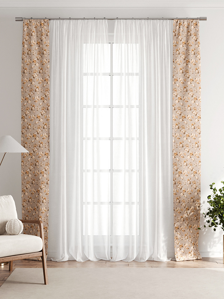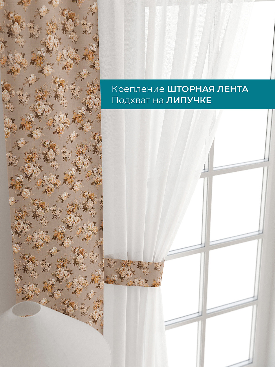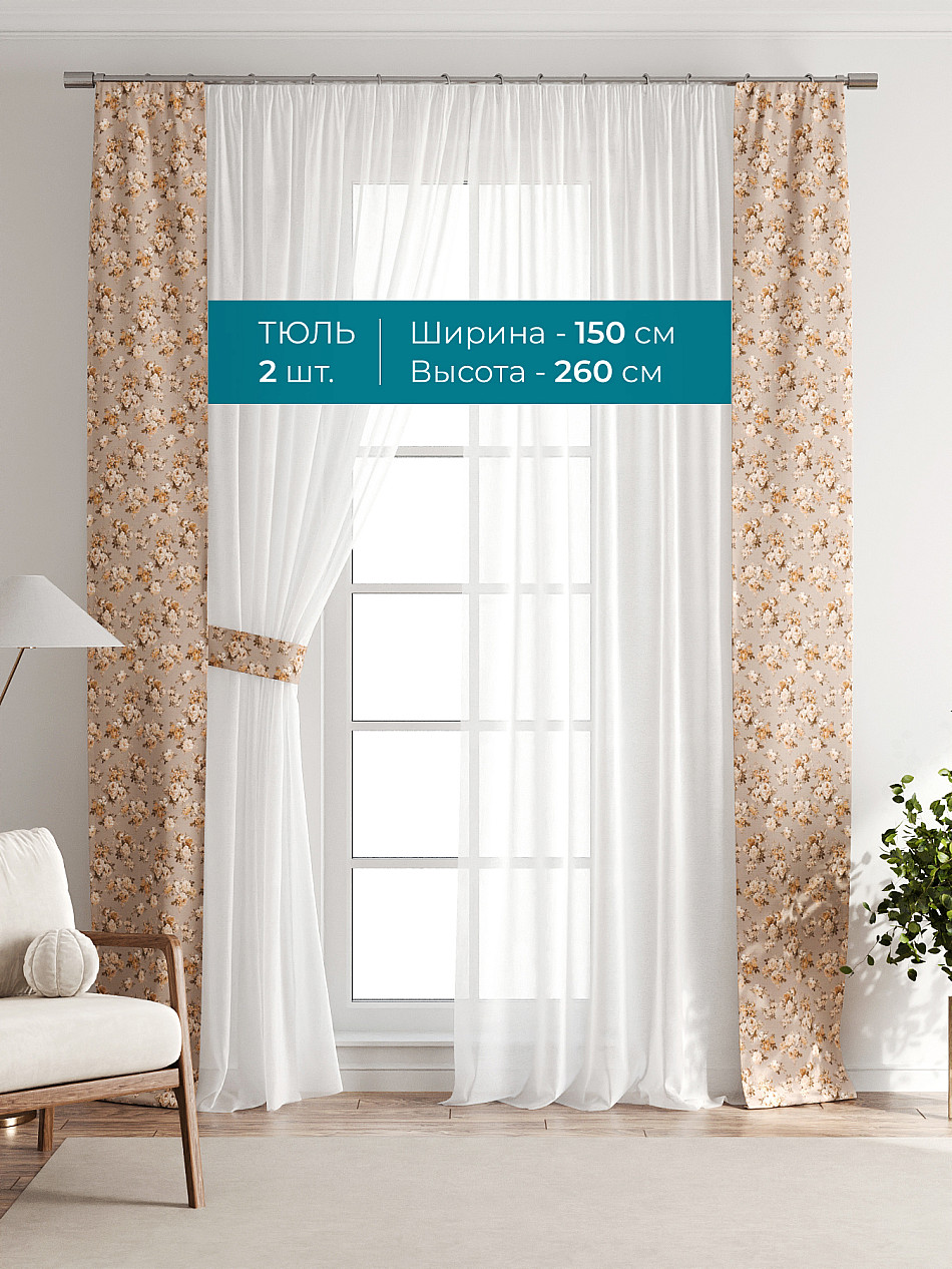 Декоративные подхваты 38х260 см — 2 шт.; Тюль 150х260 см — 2 шт. ( Изменить высоту) Крепление: шторная лента (крючки), кулиска Подробнее