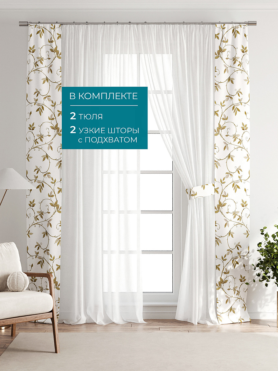 В комплект входят: - 2 полотна белого тюля шириной 150 см.. и высотой 260 см и - 2 узкие шторы шириной всего 38 см. и длиной 260 см., которые навешиваются рядом с тюлем не утяжеляя вид окна и не препятствуя попаданию солнечного света в комнату. При этом выполняют роль подхватов и добавляют акцент в интерьер.