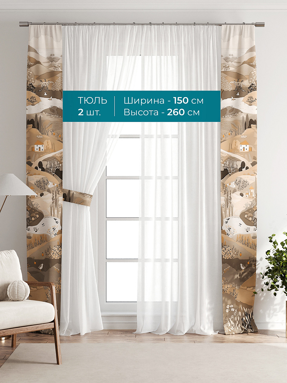 Декоративные подхваты 38х260 см — 2 шт.; Тюль 150х260 см — 2 шт. ( Изменить высоту) Крепление: шторная лента (крючки), кулиска Подробнее