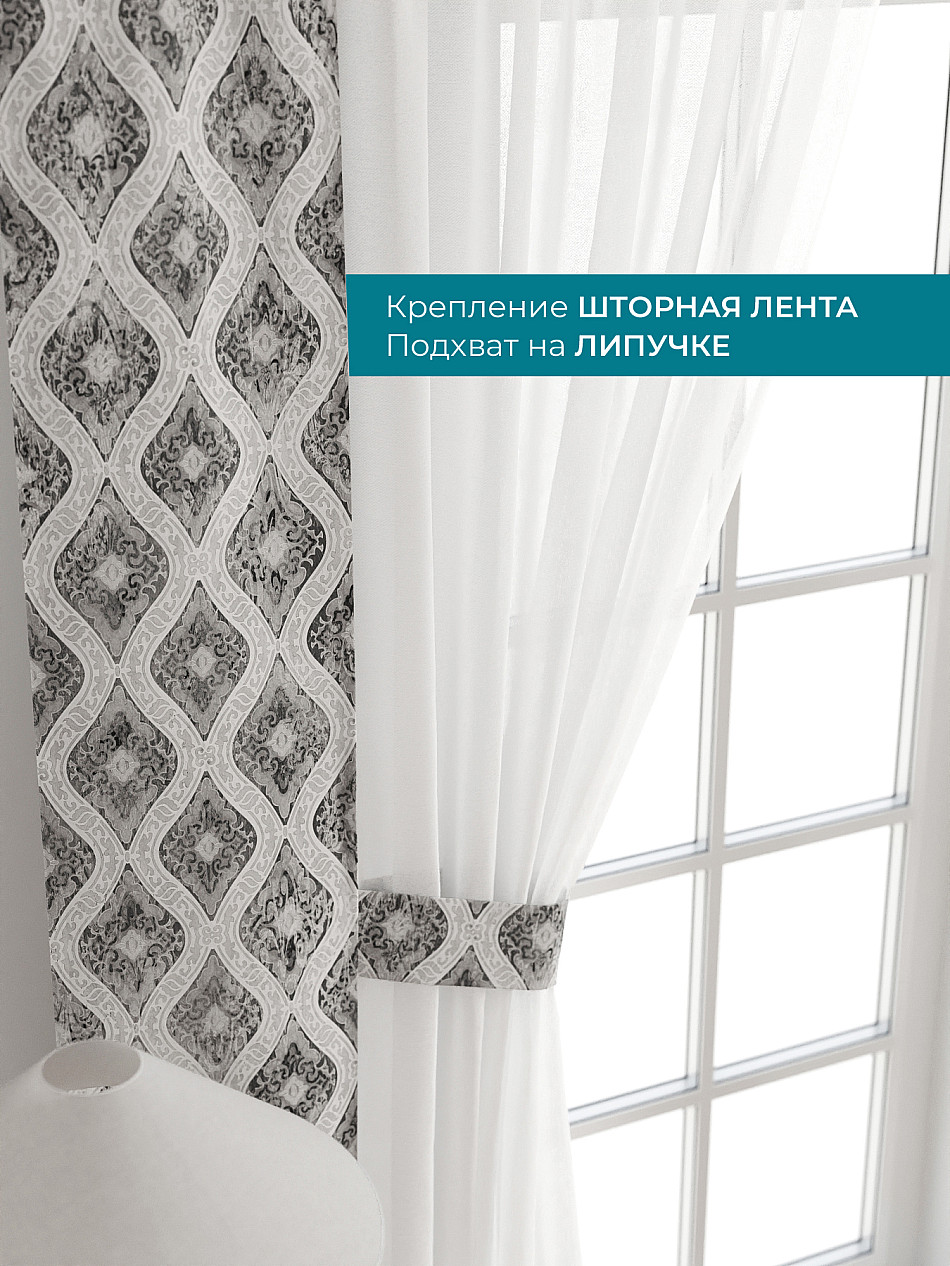 Декоративные подхваты 38х260 см — 2 шт.; Тюль 150х260 см — 2 шт. ( Изменить высоту) Крепление: шторная лента (крючки), кулиска Подробнее