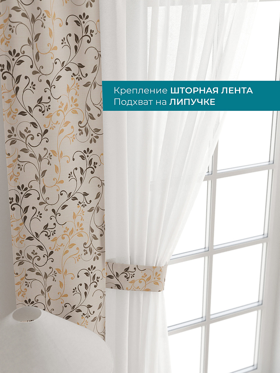 Декоративные подхваты 38х260 см — 2 шт.; Тюль 150х260 см — 2 шт. ( Изменить высоту) Крепление: шторная лента (крючки), кулиска Подробнее