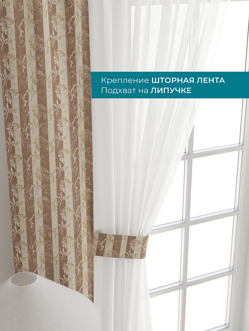 Декоративные подхваты 38х260 см — 2 шт.; Тюль 150х260 см — 2 шт. ( Изменить высоту) Крепление: шторная лента (крючки), кулиска Подробнее