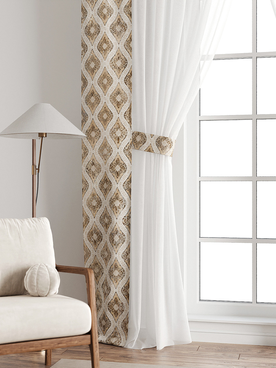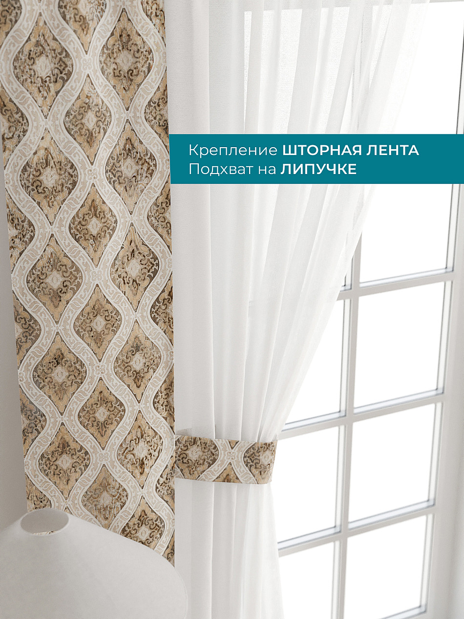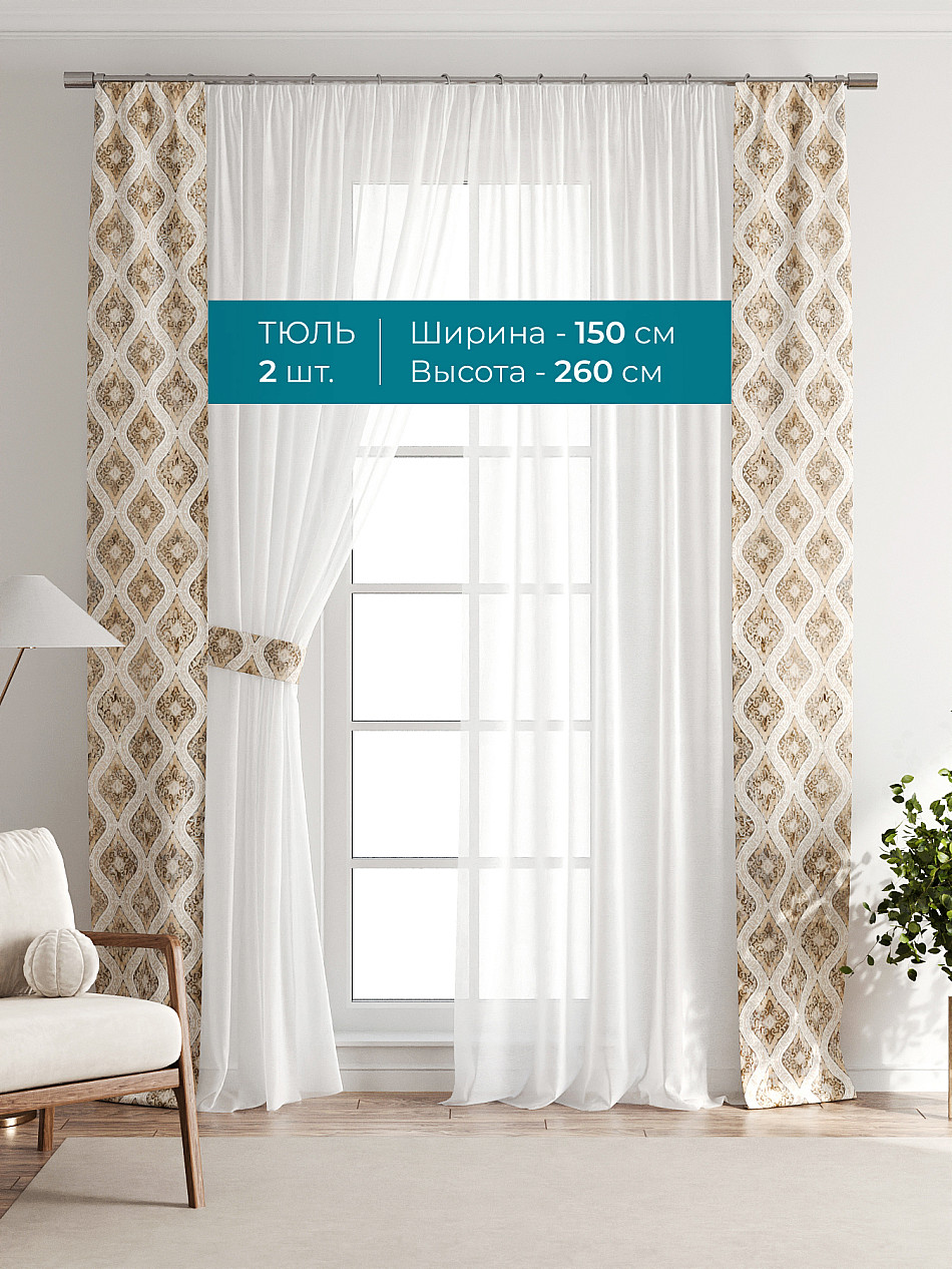 Декоративные подхваты 38х260 см — 2 шт.; Тюль 150х260 см — 2 шт. ( Изменить высоту) Крепление: шторная лента (крючки), кулиска Подробнее