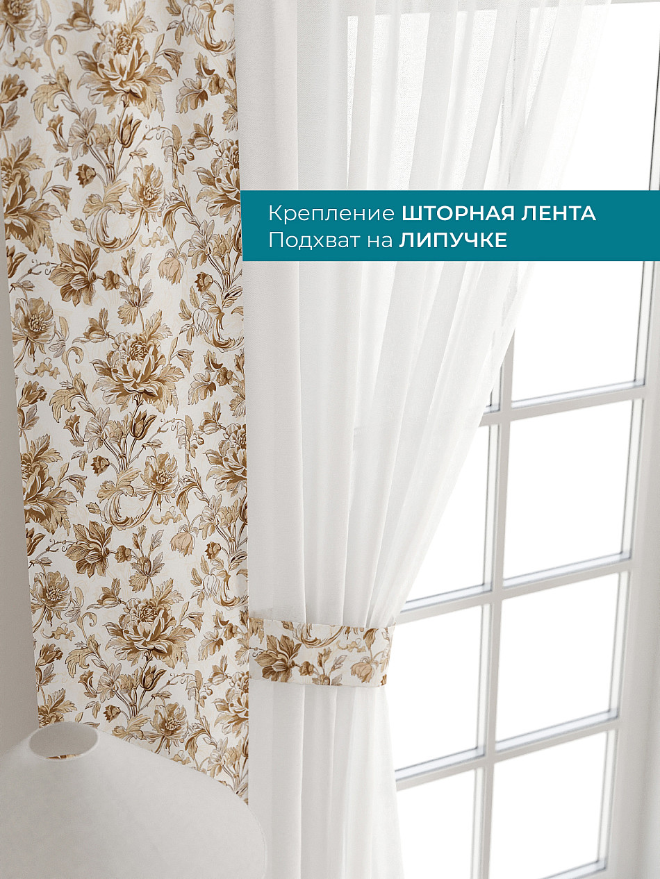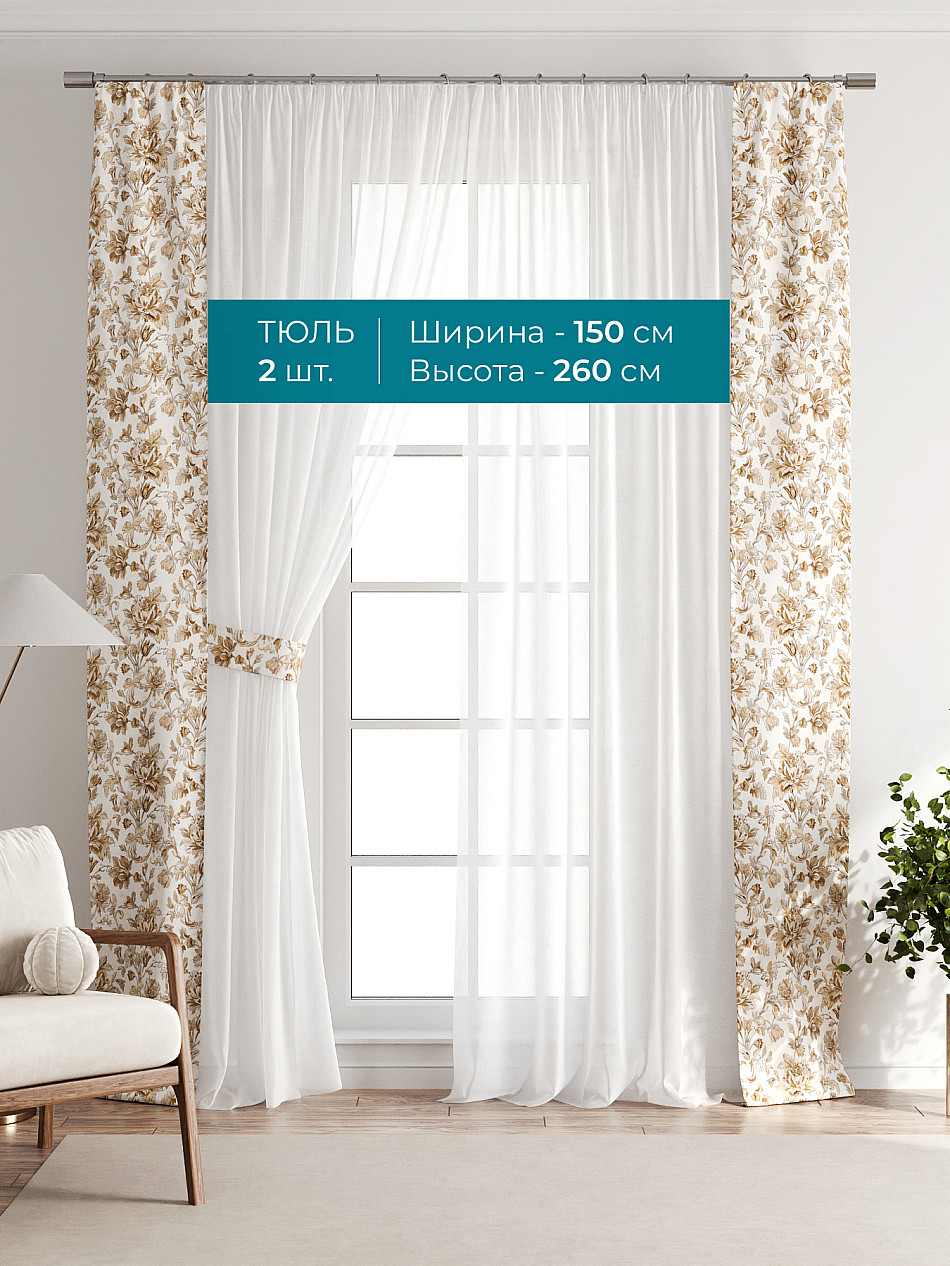 Декоративные подхваты 38х260 см — 2 шт.; Тюль 150х260 см — 2 шт. ( Изменить высоту) Крепление: шторная лента (крючки), кулиска Подробнее