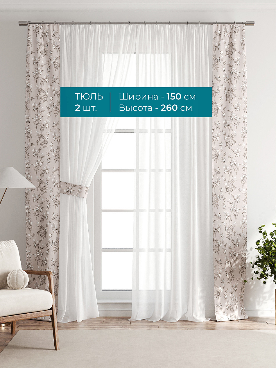 Декоративные подхваты 38х260 см — 2 шт.; Тюль 150х260 см — 2 шт. ( Изменить высоту) Крепление: шторная лента (крючки), кулиска Подробнее