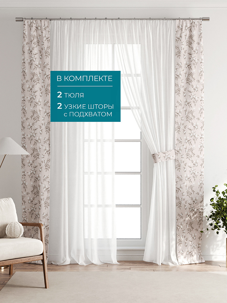 В комплект входят: - 2 полотна белого тюля шириной 150 см.. и высотой 260 см и - 2 узкие шторы шириной всего 38 см. и длиной 260 см., которые навешиваются рядом с тюлем не утяжеляя вид окна и не препятствуя попаданию солнечного света в комнату. При этом выполняют роль подхватов и добавляют акцент в интерьер.