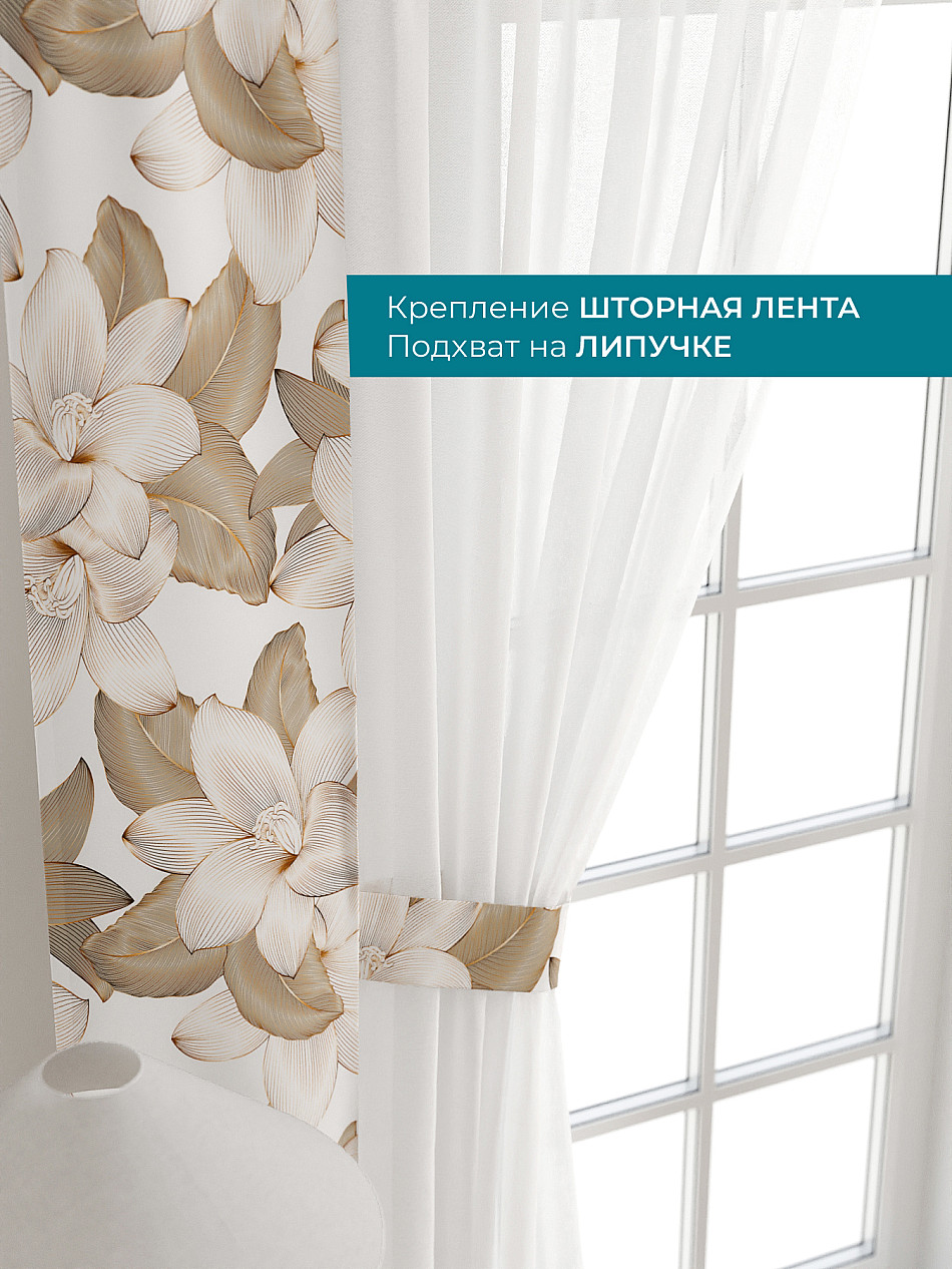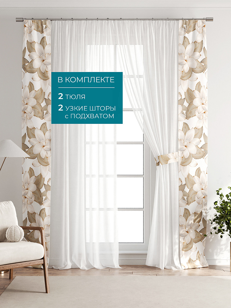 Декоративные подхваты 38х260 см — 2 шт.; Тюль 150х260 см — 2 шт. ( Изменить высоту) Крепление: шторная лента (крючки), кулиска Подробнее