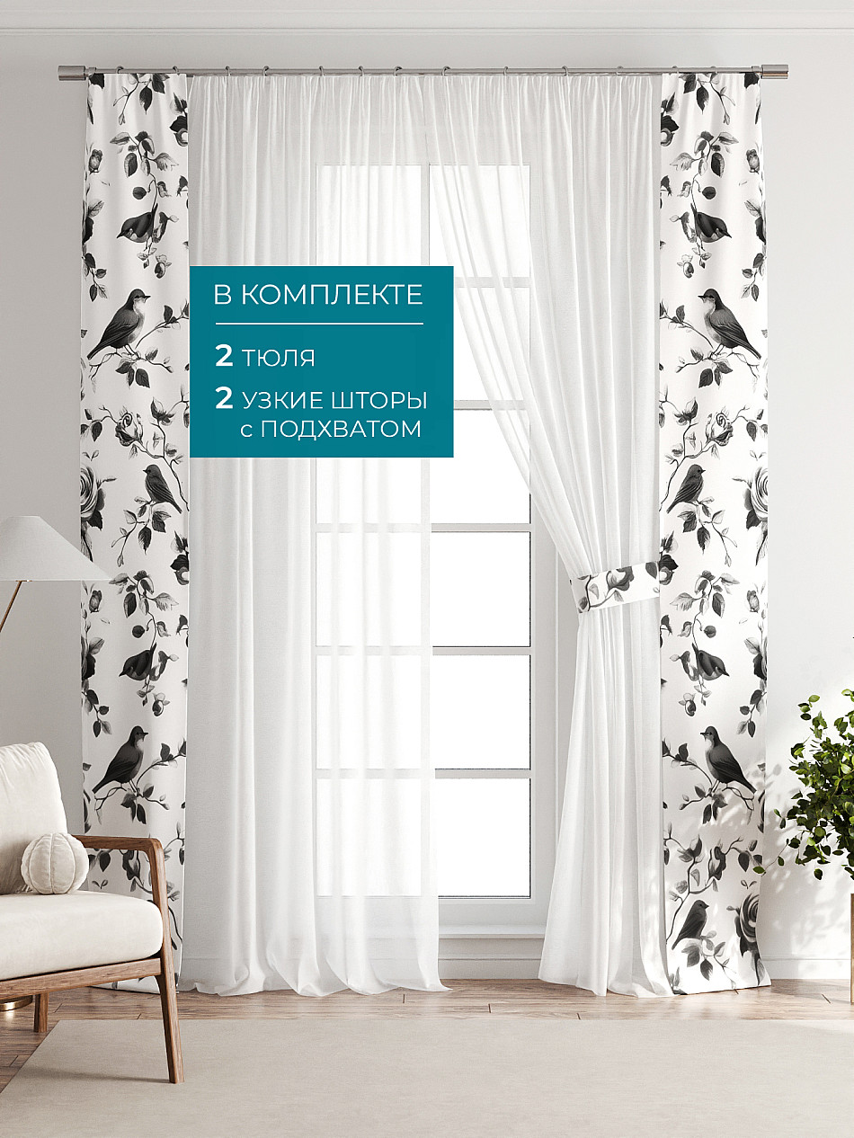 В комплект входят: - 2 полотна белого тюля шириной 150 см.. и высотой 260 см и - 2 узкие шторы шириной всего 38 см. и длиной 260 см., которые навешиваются рядом с тюлем не утяжеляя вид окна и не препятствуя попаданию солнечного света в комнату. При этом выполняют роль подхватов и добавляют акцент в интерьер.
