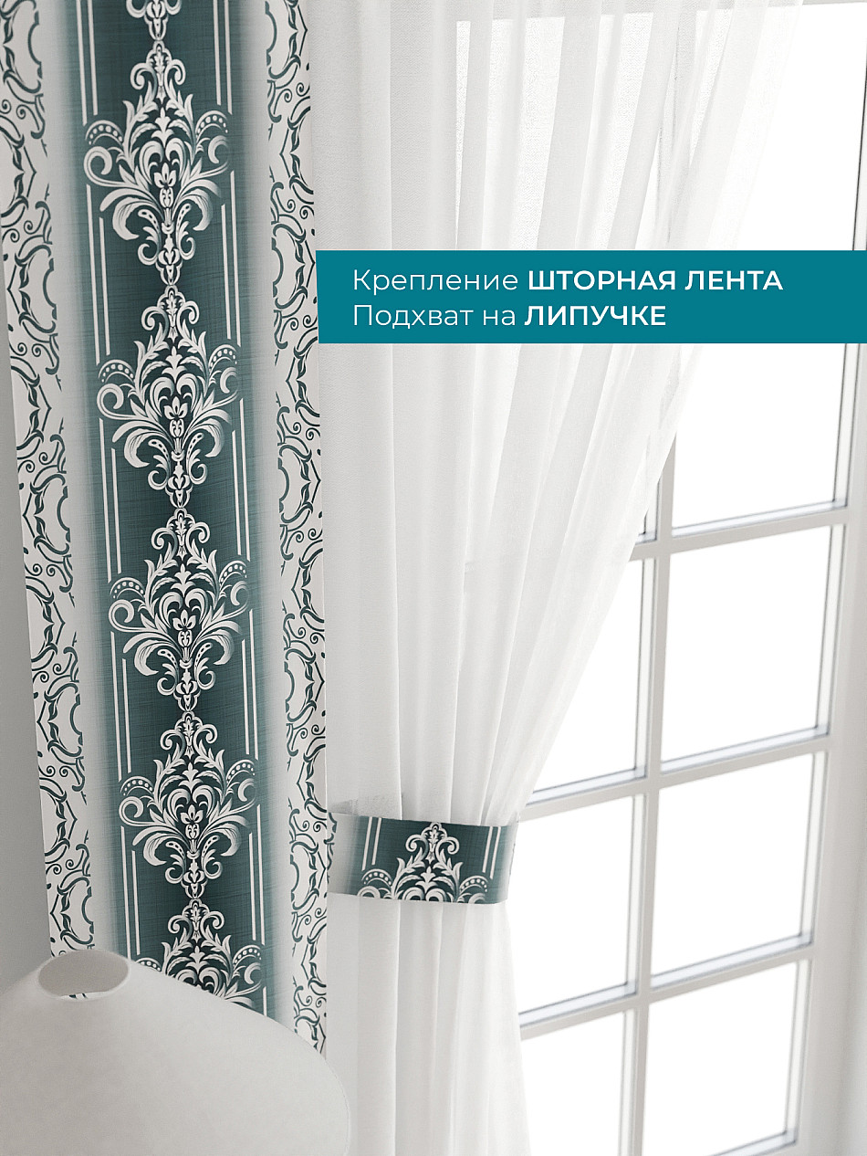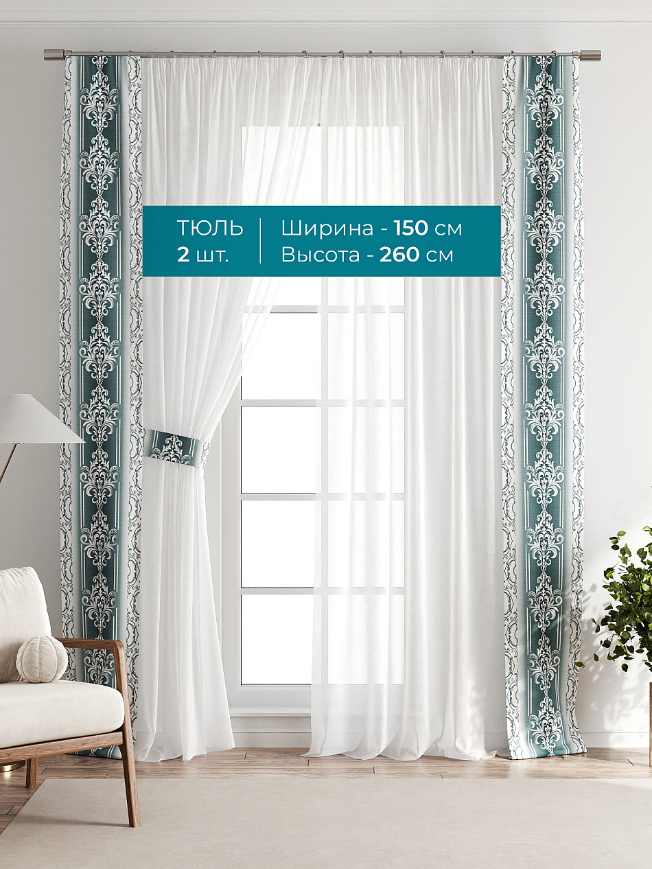 Декоративные подхваты 38х260 см — 2 шт.; Тюль 150х260 см — 2 шт. ( Изменить высоту) Крепление: шторная лента (крючки), кулиска Подробнее