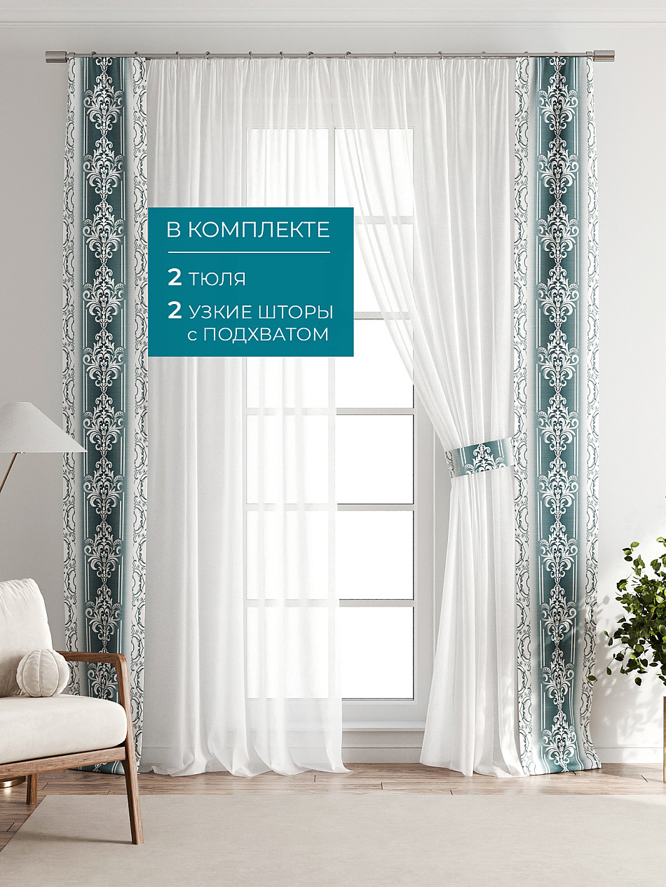 В комплект входят: - 2 полотна белого тюля шириной 150 см.. и высотой 260 см и - 2 узкие шторы шириной всего 38 см. и длиной 260 см., которые навешиваются рядом с тюлем не утяжеляя вид окна и не препятствуя попаданию солнечного света в комнату. При этом выполняют роль подхватов и добавляют акцент в интерьер.