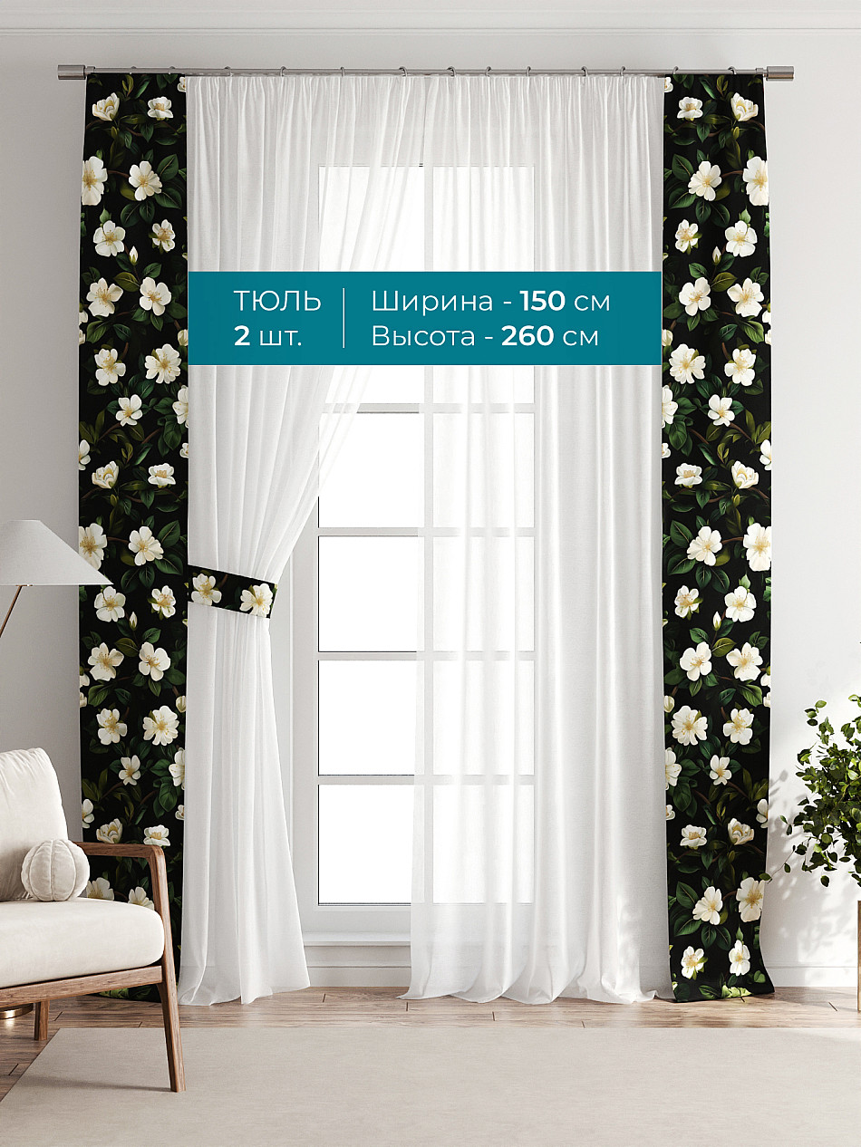 Декоративные подхваты 38х260 см — 2 шт.; Тюль 150х260 см — 2 шт. ( Изменить высоту) Крепление: шторная лента (крючки), кулиска Подробнее