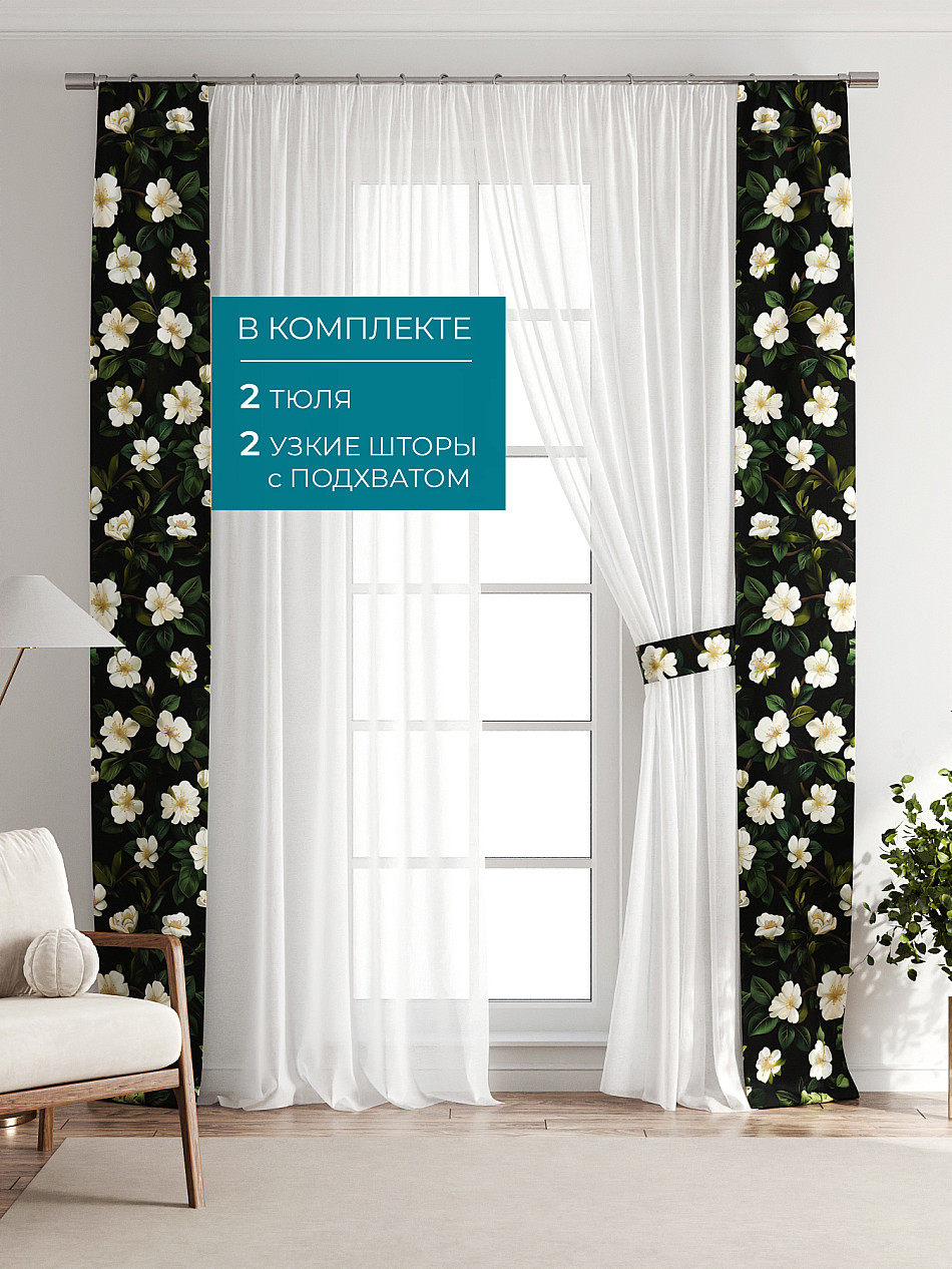 В комплект входят: - 2 полотна белого тюля шириной 150 см.. и высотой 260 см и - 2 узкие шторы шириной всего 38 см. и длиной 260 см., которые навешиваются рядом с тюлем не утяжеляя вид окна и не препятствуя попаданию солнечного света в комнату. При этом выполняют роль подхватов и добавляют акцент в интерьер.