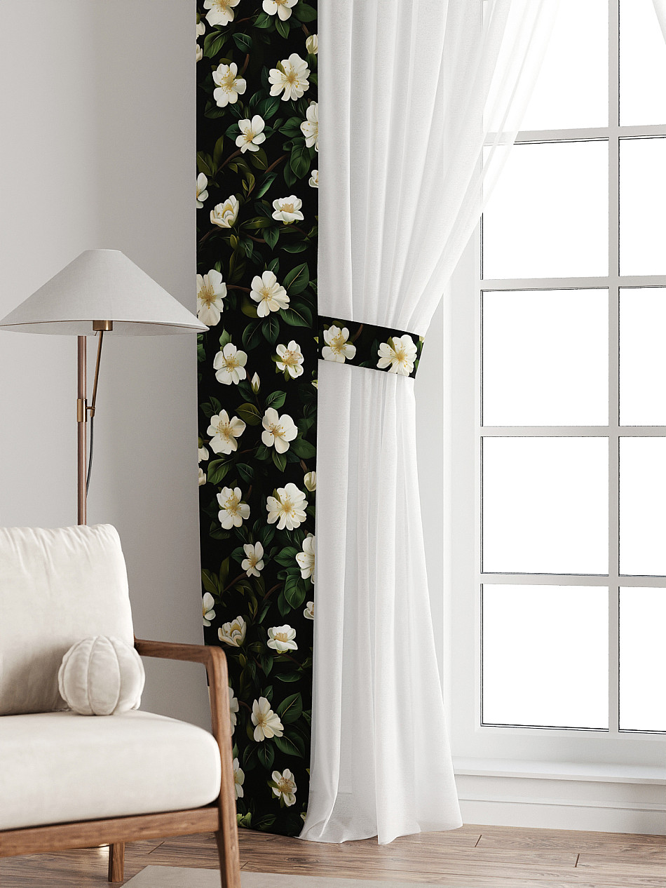 На высоте 125 см. пришит подхват (ширина 10 см.), который позволяет легко зафиксировать тюль или шторы в нужном положении при помощи липучки.