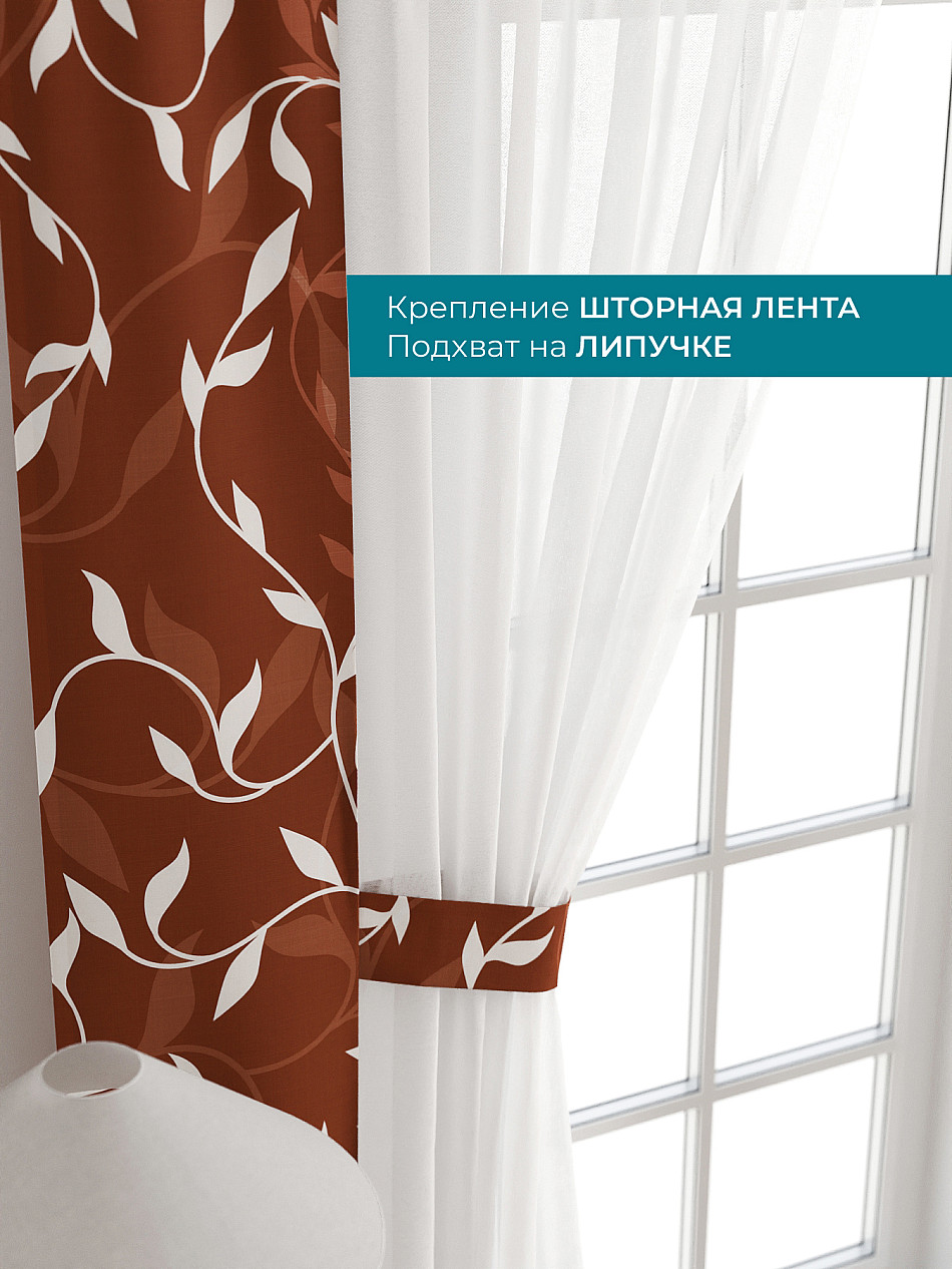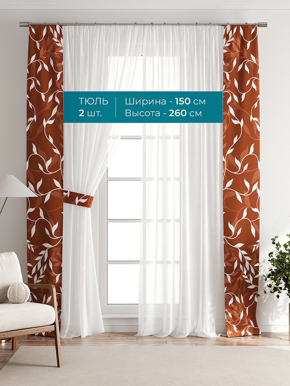 Декоративные подхваты 38х260 см — 2 шт.; Тюль 150х260 см — 2 шт. ( Изменить высоту) Крепление: шторная лента (крючки), кулиска Подробнее