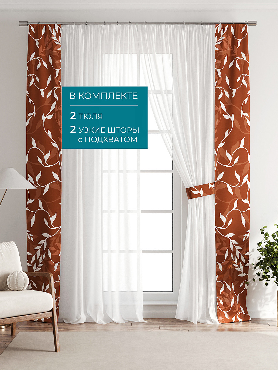 В комплект входят: - 2 полотна белого тюля шириной 150 см.. и высотой 260 см и - 2 узкие шторы шириной всего 38 см. и длиной 260 см., которые навешиваются рядом с тюлем не утяжеляя вид окна и не препятствуя попаданию солнечного света в комнату. При этом выполняют роль подхватов и добавляют акцент в интерьер.