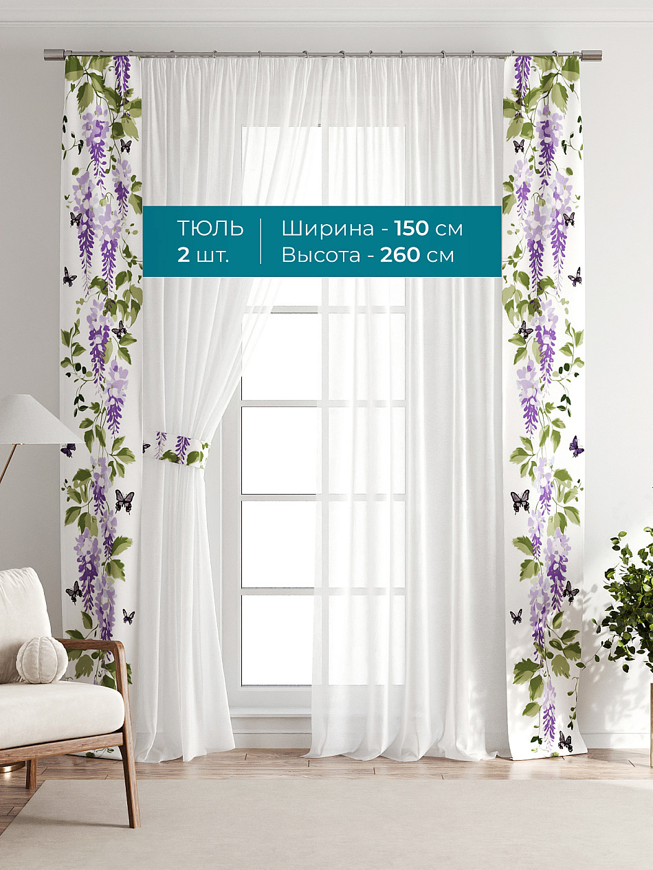Декоративные подхваты 38х260 см — 2 шт.; Тюль 150х260 см — 2 шт. ( Изменить высоту) Крепление: шторная лента (крючки), кулиска Подробнее