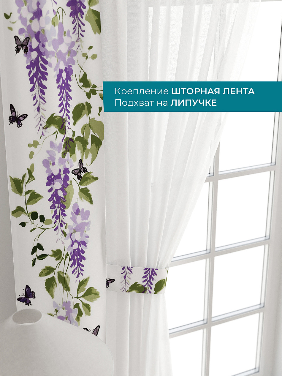 На высоте 125 см. пришит подхват (ширина 10 см.), который позволяет легко зафиксировать тюль или шторы в нужном положении при помощи липучки.