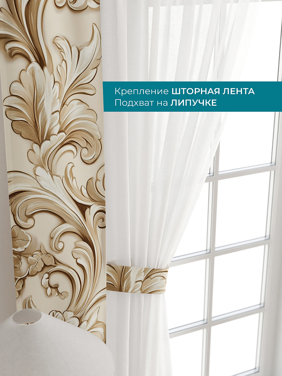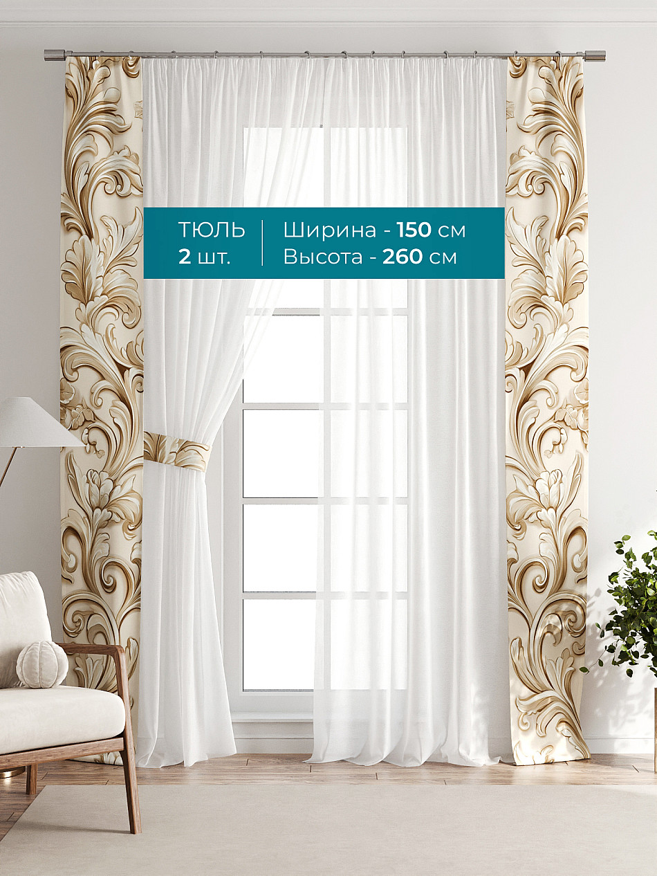 Декоративные подхваты 38х260 см — 2 шт.; Тюль 150х260 см — 2 шт. ( Изменить высоту) Крепление: шторная лента (крючки), кулиска Подробнее