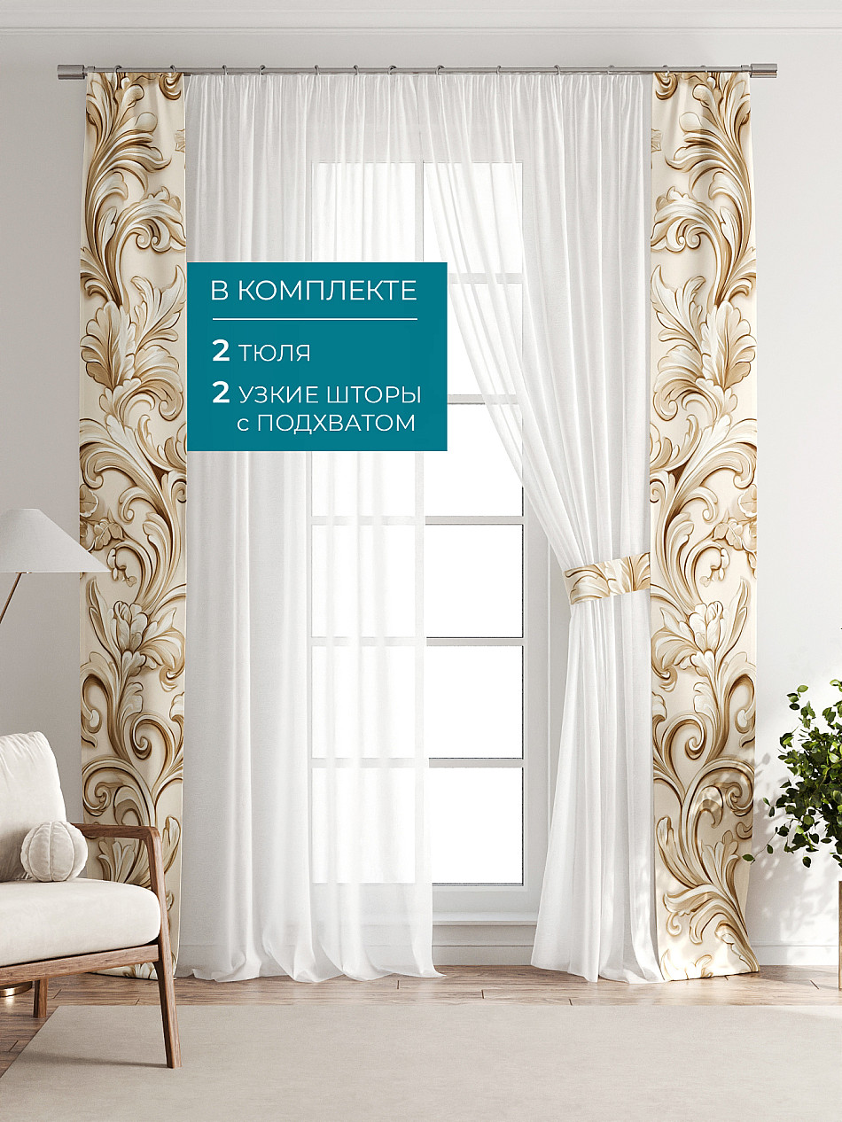 В комплект входят: - 2 полотна белого тюля шириной 150 см.. и высотой 260 см и - 2 узкие шторы шириной всего 38 см. и длиной 260 см., которые навешиваются рядом с тюлем не утяжеляя вид окна и не препятствуя попаданию солнечного света в комнату. При этом выполняют роль подхватов и добавляют акцент в интерьер.