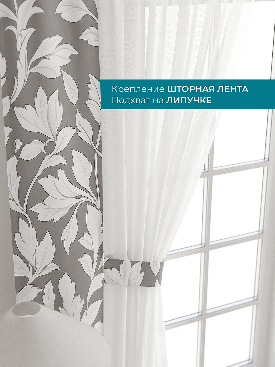 Декоративные подхваты 38х260 см — 2 шт.; Тюль 150х260 см — 2 шт. ( Изменить высоту) Крепление: шторная лента (крючки), кулиска Подробнее