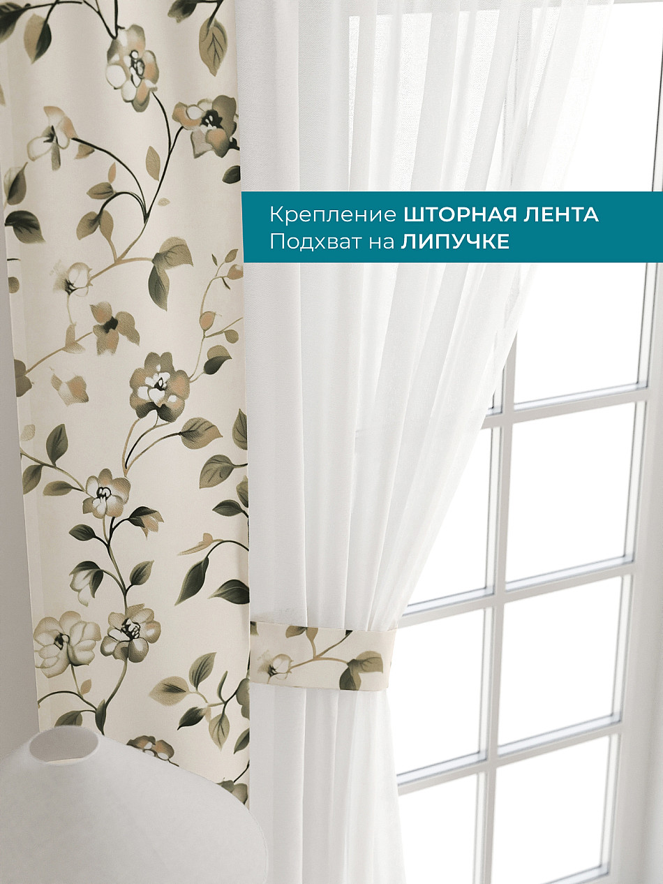 Декоративные подхваты 38х260 см — 2 шт.; Тюль 150х260 см — 2 шт. ( Изменить высоту) Крепление: шторная лента (крючки), кулиска Подробнее