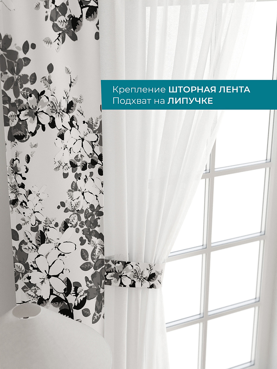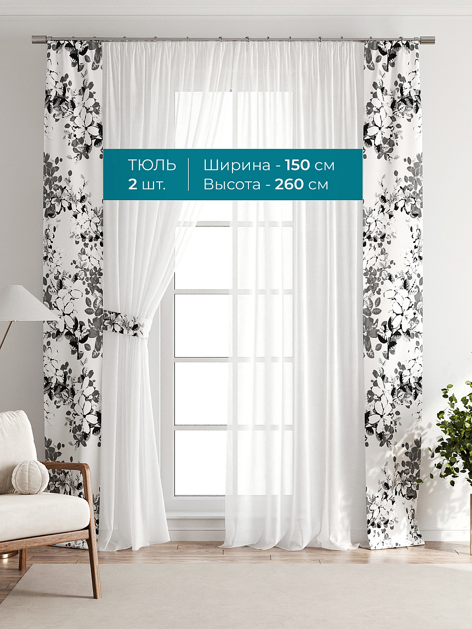 Декоративные подхваты 38х260 см — 2 шт.; Тюль 150х260 см — 2 шт. ( Изменить высоту) Крепление: шторная лента (крючки), кулиска Подробнее