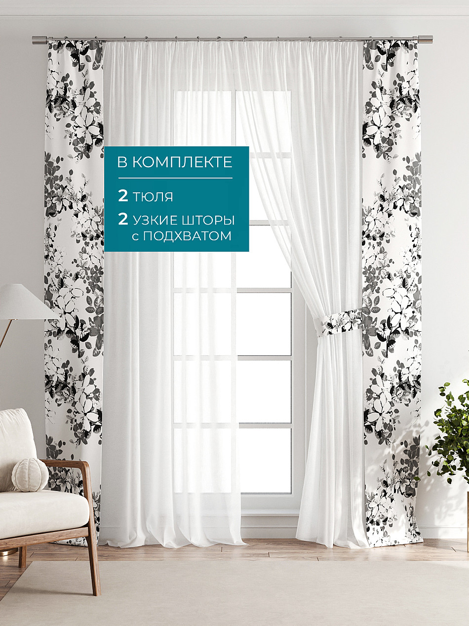 В комплект входят: - 2 полотна белого тюля шириной 150 см.. и высотой 260 см и - 2 узкие шторы шириной всего 38 см. и длиной 260 см., которые навешиваются рядом с тюлем не утяжеляя вид окна и не препятствуя попаданию солнечного света в комнату. При этом выполняют роль подхватов и добавляют акцент в интерьер.