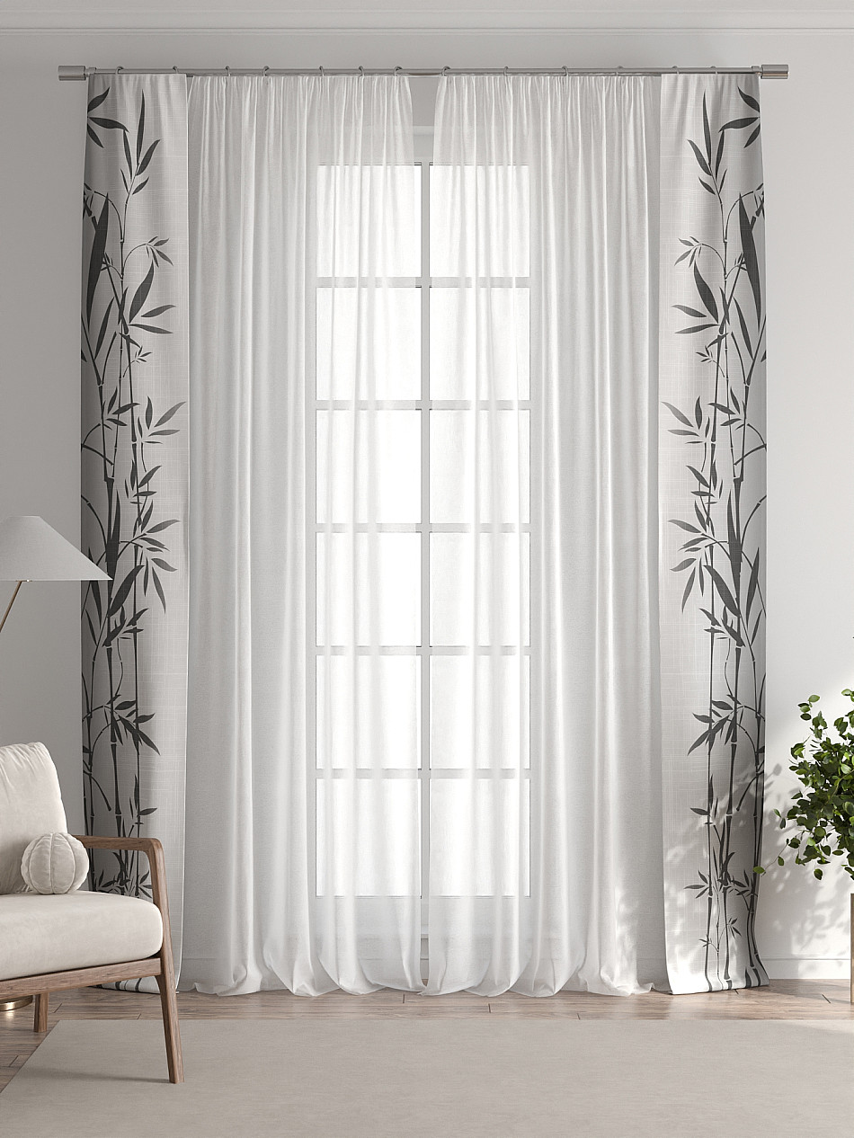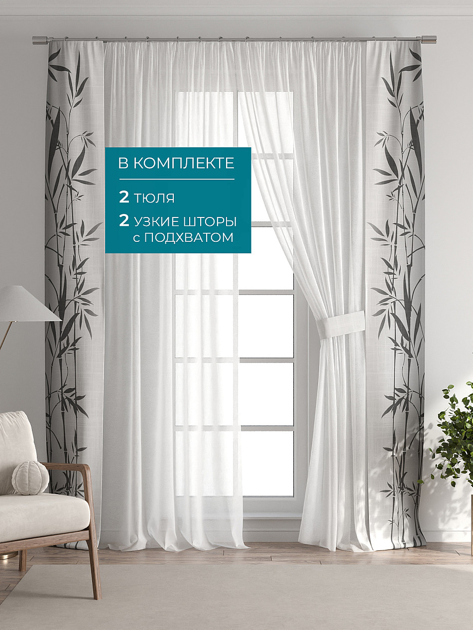 В комплект входят: - 2 полотна белого тюля шириной 150 см.. и высотой 260 см и - 2 узкие шторы шириной всего 38 см. и длиной 260 см., которые навешиваются рядом с тюлем не утяжеляя вид окна и не препятствуя попаданию солнечного света в комнату. При этом выполняют роль подхватов и добавляют акцент в интерьер.