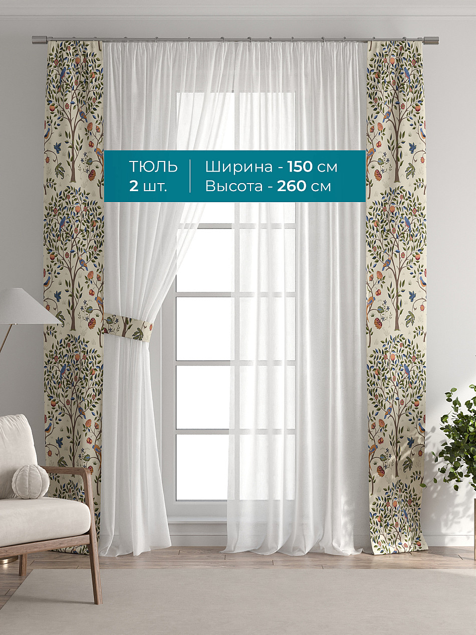 Декоративные подхваты 38х260 см — 2 шт.; Тюль 150х260 см — 2 шт. ( Изменить высоту) Крепление: шторная лента (крючки), кулиска Подробнее