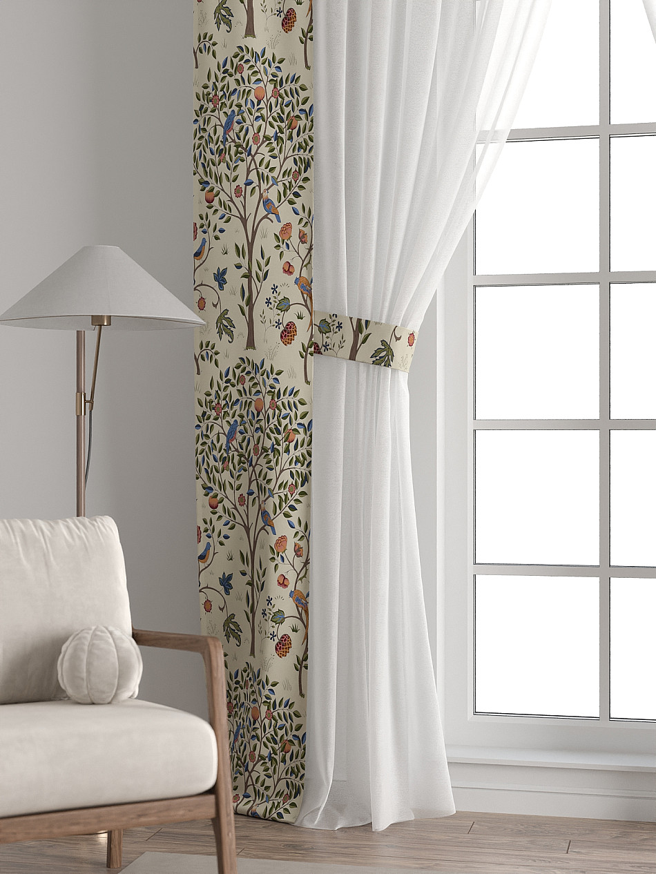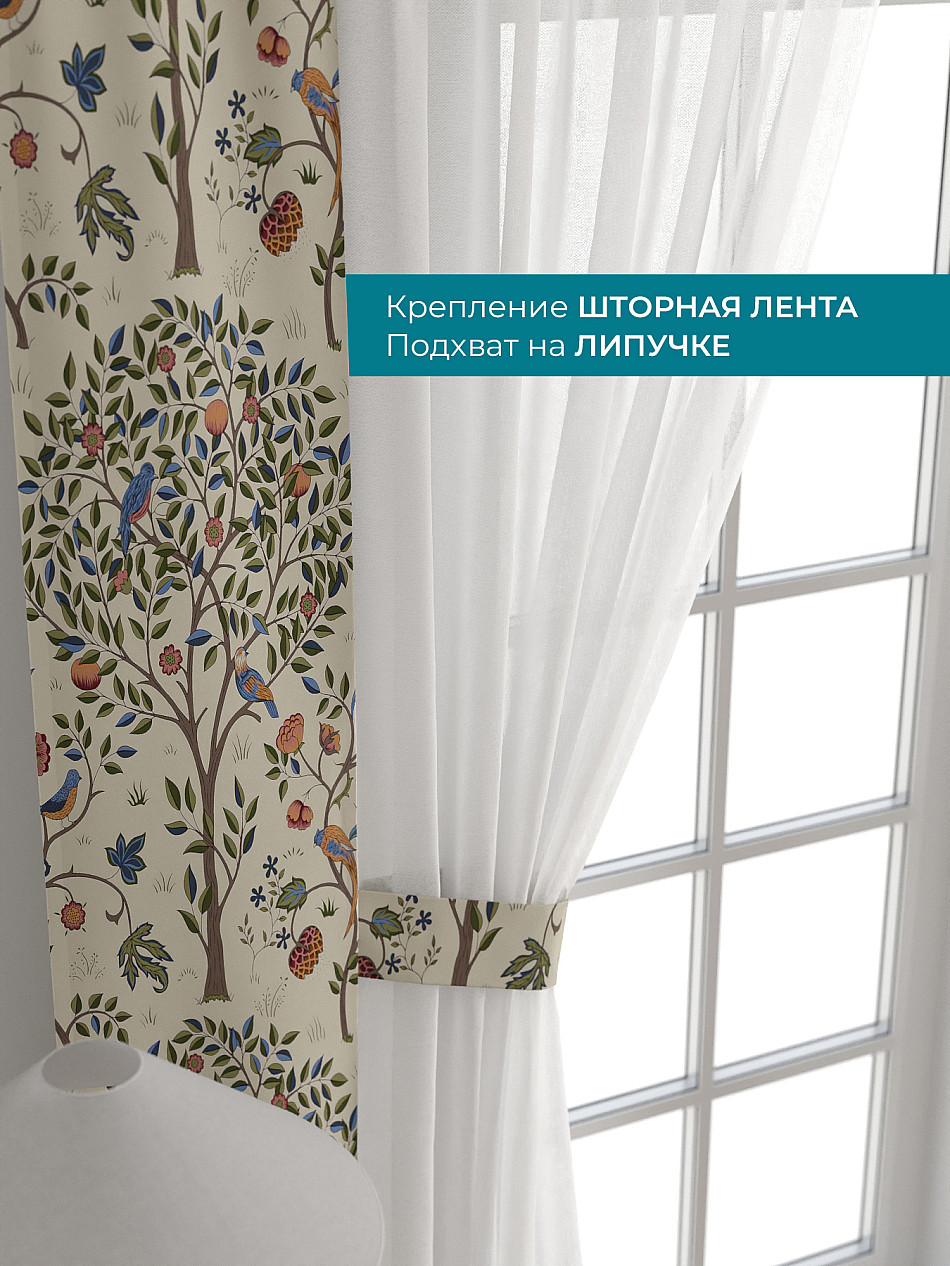 Комплект готов к развешиванию. По верхнему краю пристрочена шторная лента 6 см, с 2-мя рядами петель под крючки, что позволяет регулировать высоту. Одновременно имеется кулиска (карман для штанги), в которую можно продеть карниз любого диаметра.