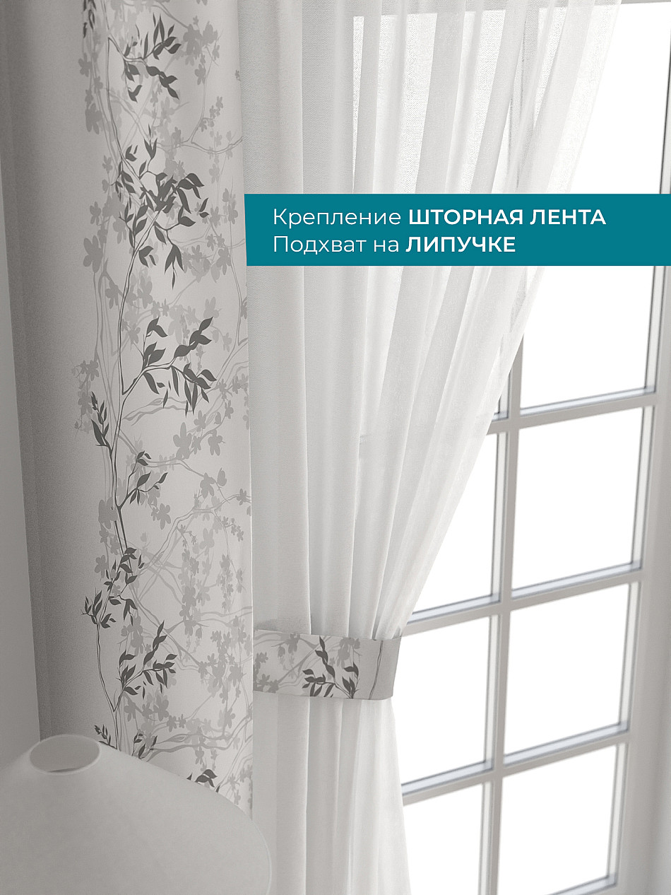 Декоративные подхваты 38х260 см — 2 шт.; Тюль 150х260 см — 2 шт. ( Изменить высоту) Крепление: шторная лента (крючки), кулиска Подробнее