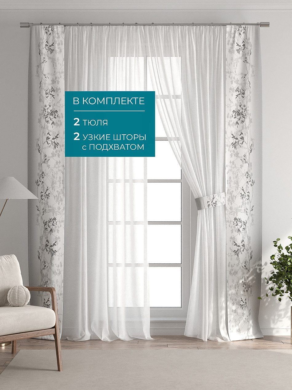 В комплект входят: - 2 полотна белого тюля шириной 150 см.. и высотой 260 см и - 2 узкие шторы шириной всего 38 см. и длиной 260 см., которые навешиваются рядом с тюлем не утяжеляя вид окна и не препятствуя попаданию солнечного света в комнату. При этом выполняют роль подхватов и добавляют акцент в интерьер.