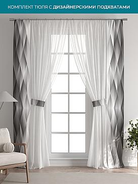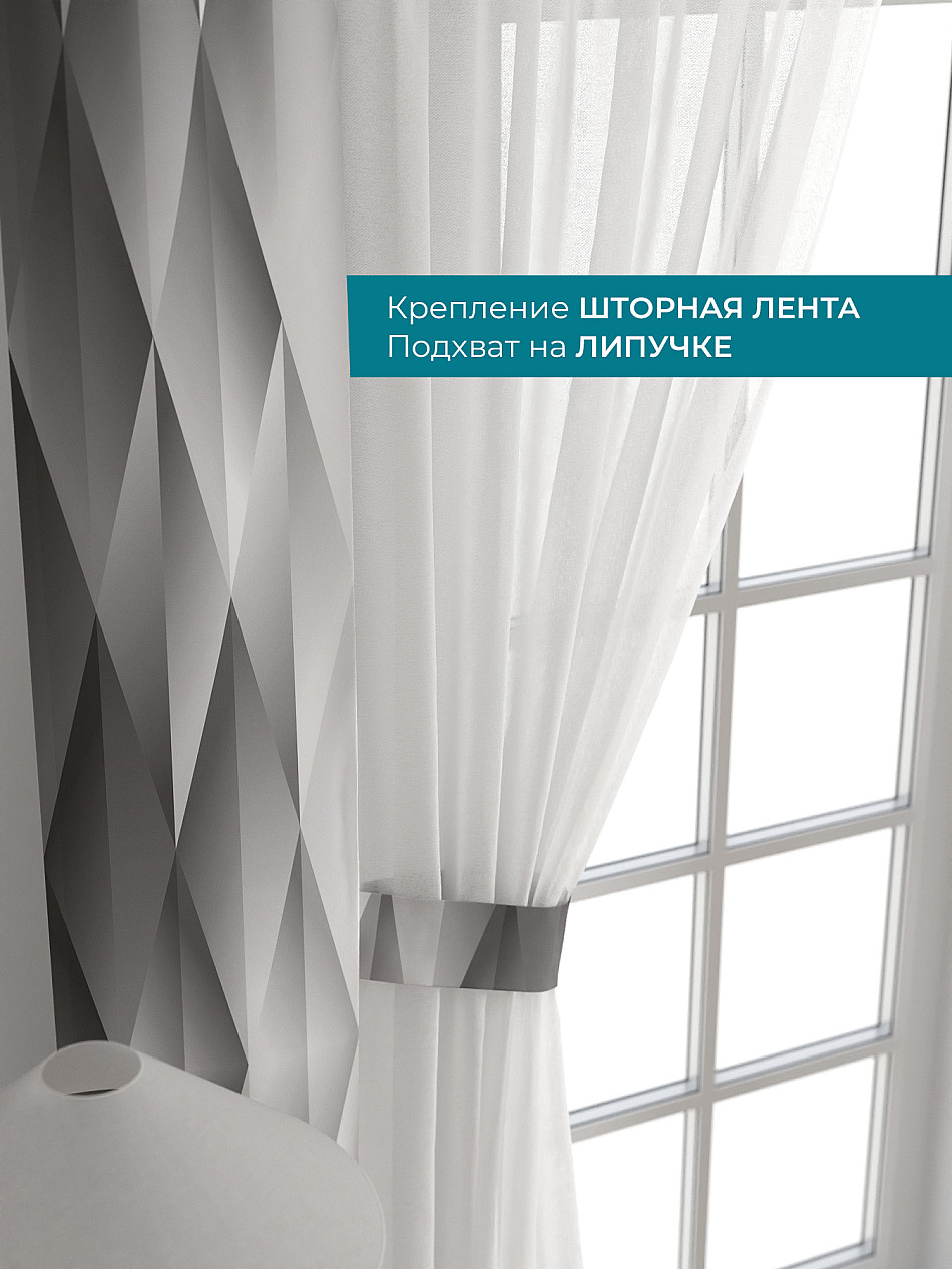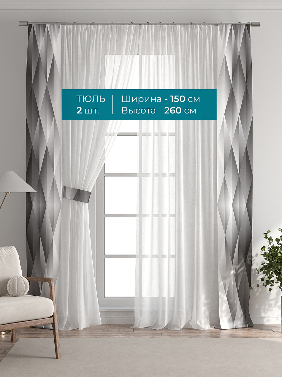 Декоративные подхваты 38х260 см — 2 шт.; Тюль 150х260 см — 2 шт. ( Изменить высоту) Крепление: шторная лента (крючки), кулиска Подробнее