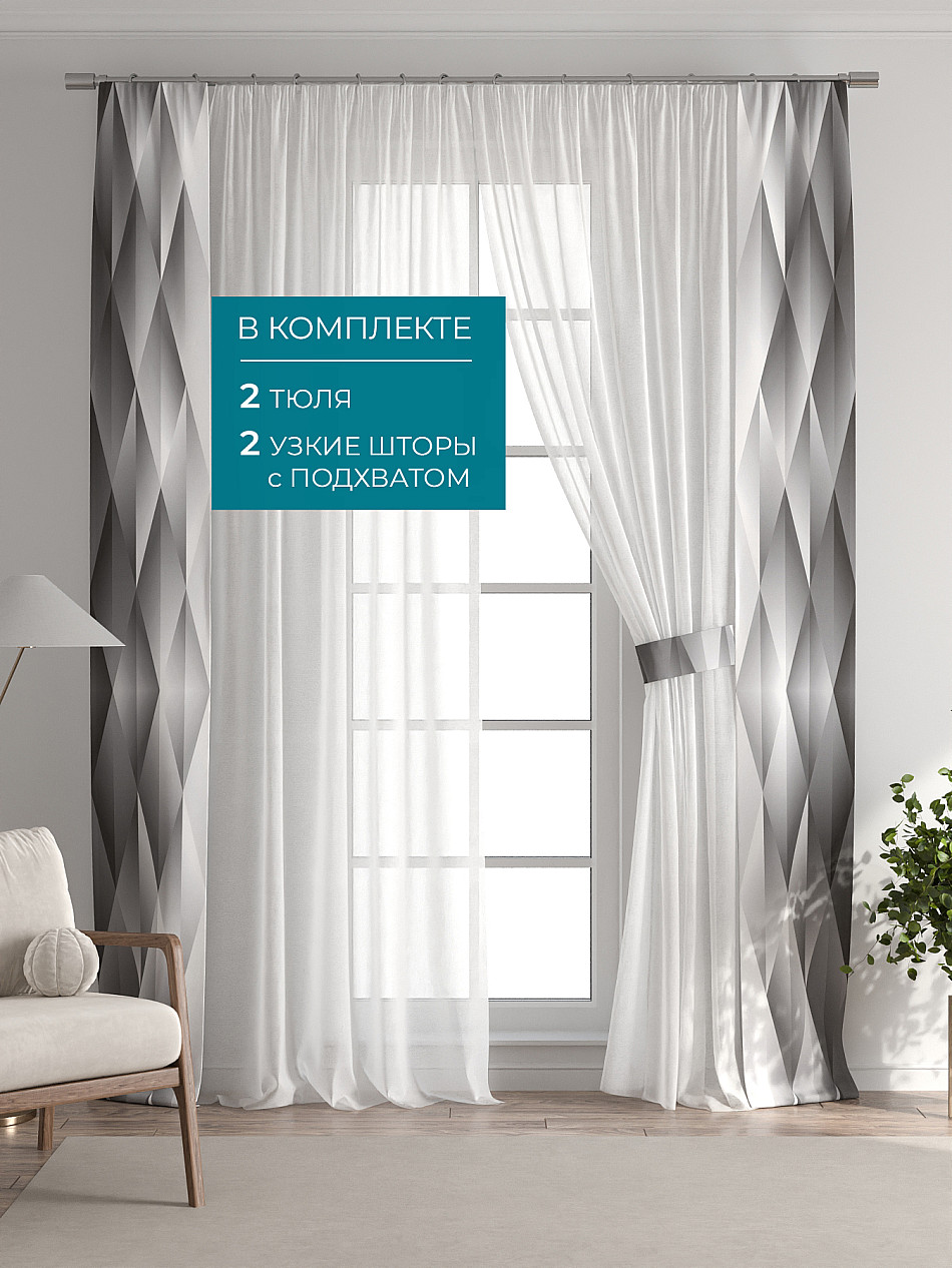 В комплект входят: - 2 полотна белого тюля шириной 150 см.. и высотой 260 см и - 2 узкие шторы шириной всего 38 см. и длиной 260 см., которые навешиваются рядом с тюлем не утяжеляя вид окна и не препятствуя попаданию солнечного света в комнату. При этом выполняют роль подхватов и добавляют акцент в интерьер.