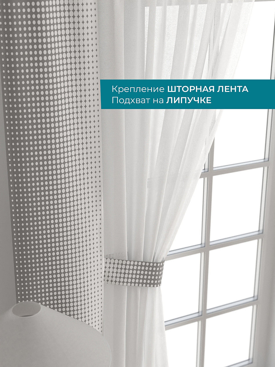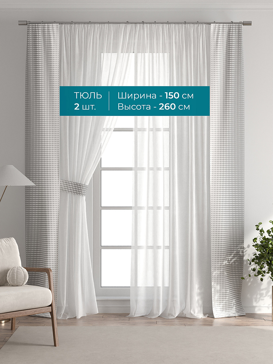 Декоративные подхваты 38х260 см — 2 шт.; Тюль 150х260 см — 2 шт. ( Изменить высоту) Крепление: шторная лента (крючки), кулиска Подробнее