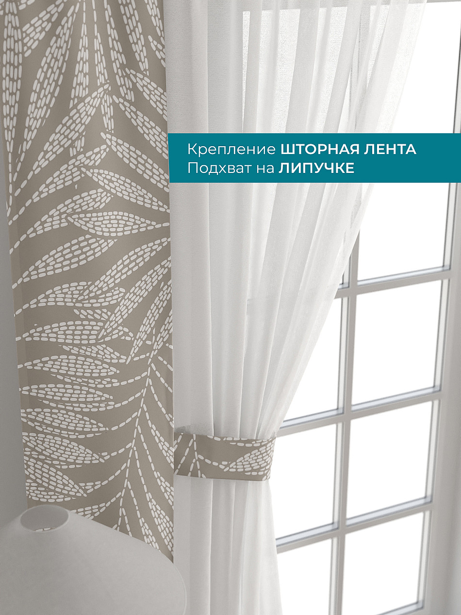 Декоративные подхваты 38х260 см — 2 шт.; Тюль 150х260 см — 2 шт. ( Изменить высоту) Крепление: шторная лента (крючки), кулиска Подробнее