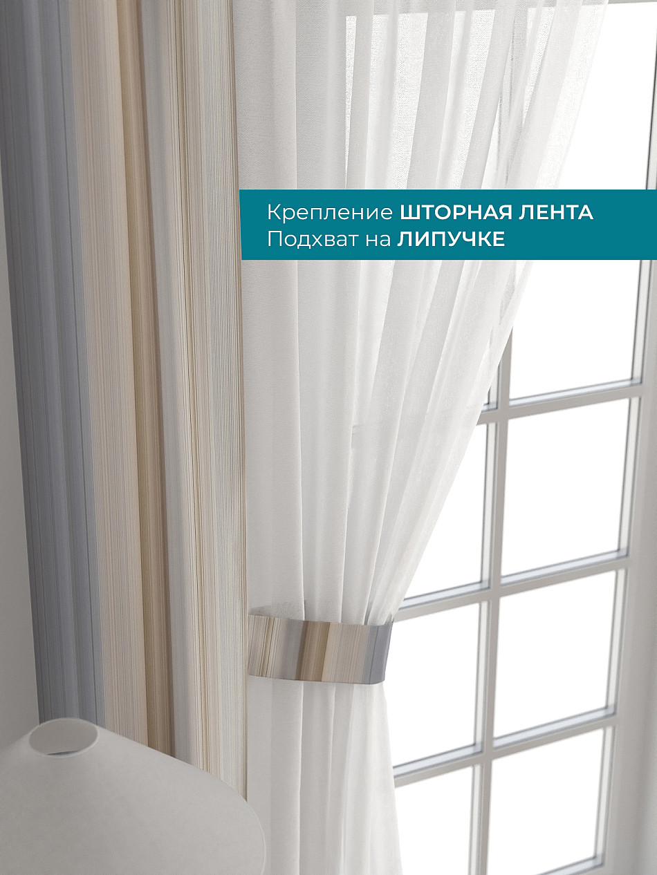Декоративные подхваты 38х260 см — 2 шт.; Тюль 150х260 см — 2 шт. ( Изменить высоту) Крепление: шторная лента (крючки), кулиска Подробнее