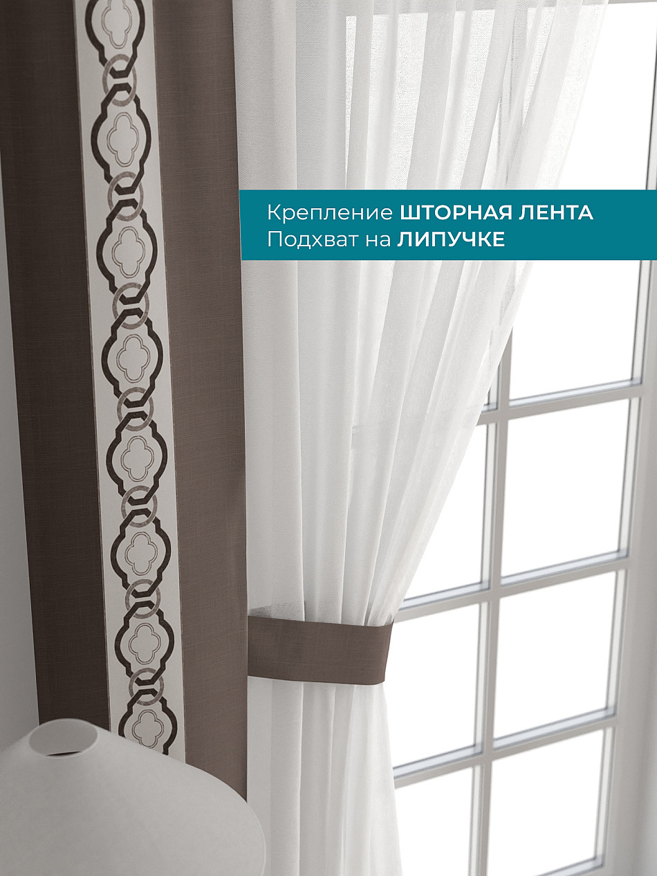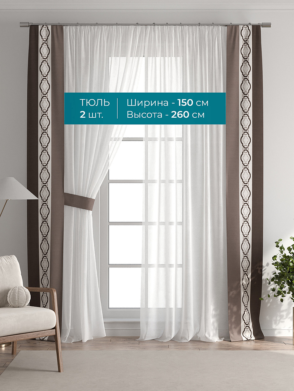 Декоративные подхваты 38х260 см — 2 шт.; Тюль 150х260 см — 2 шт. ( Изменить высоту) Крепление: шторная лента (крючки), кулиска Подробнее