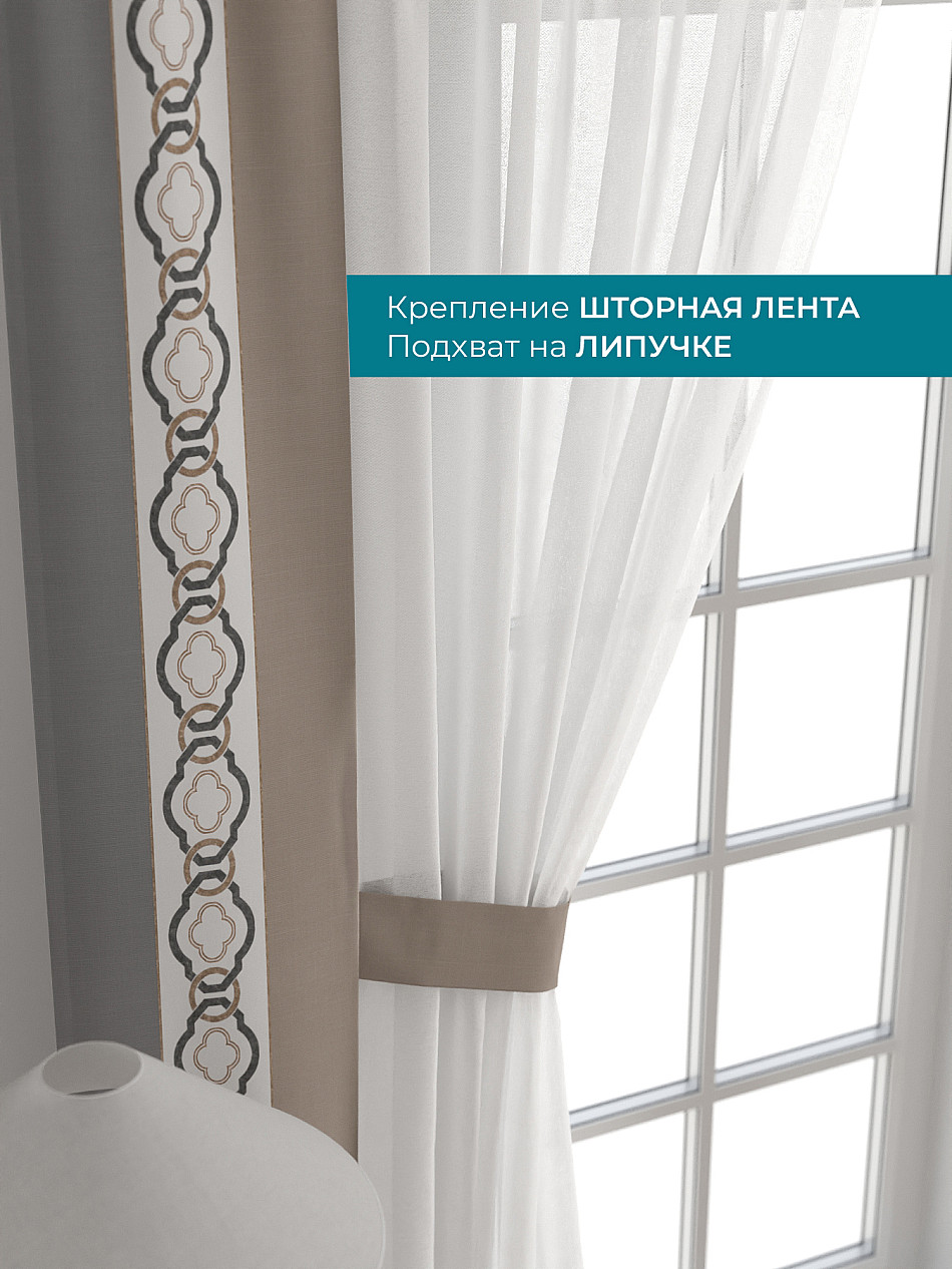 Декоративные подхваты 38х260 см — 2 шт.; Тюль 150х260 см — 2 шт. ( Изменить высоту) Крепление: шторная лента (крючки), кулиска Подробнее