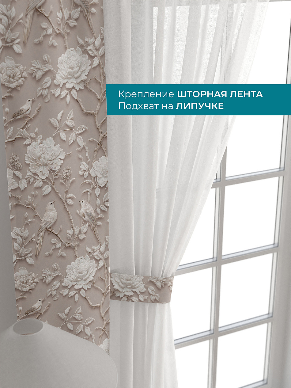 Декоративные подхваты 38х260 см — 2 шт.; Тюль 150х260 см — 2 шт. ( Изменить высоту) Крепление: шторная лента (крючки), кулиска Подробнее