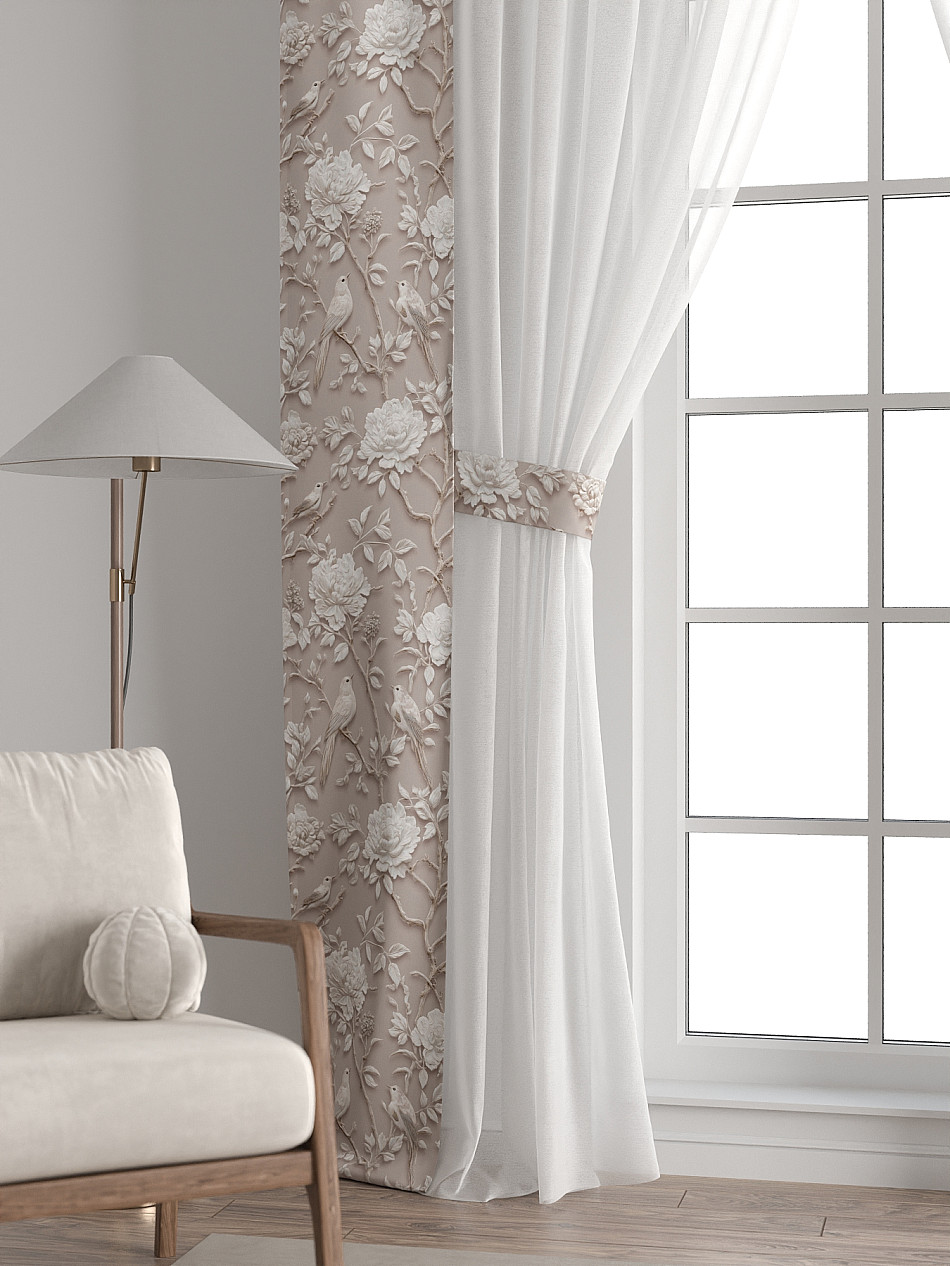 На высоте 125 см. пришит подхват (ширина 10 см.), который позволяет легко зафиксировать тюль или шторы в нужном положении при помощи липучки.